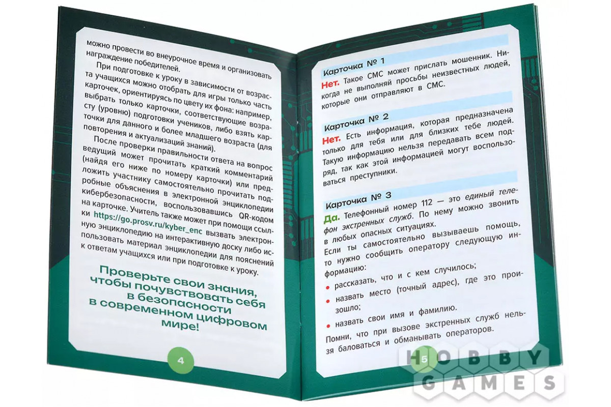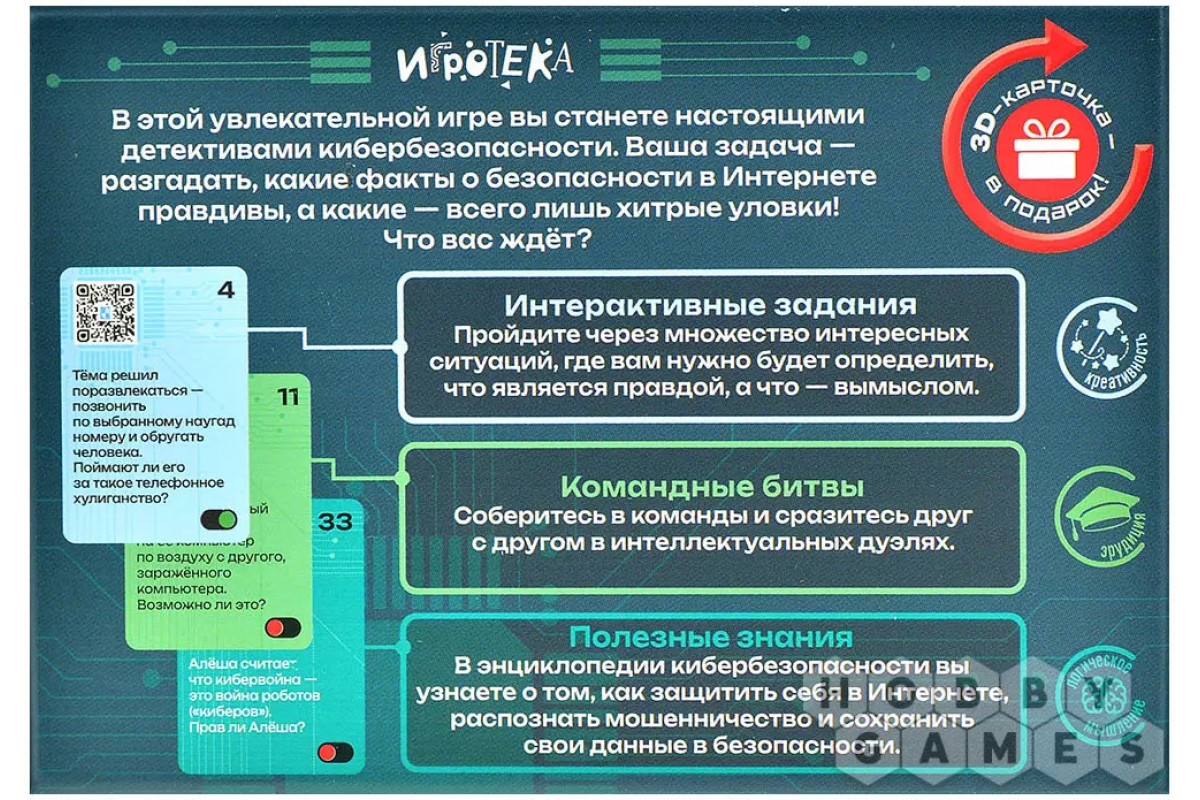 Вас ждут более пятидесяти карт с вопросами, где нужно выбрать "да" или "нет". За каждым утверждением скрывается либо правило безопасности, либо уловка мошенников. Уровни сложности распределены по возрастам. А на лицевой стороне спрятаны подсказки – осталось лишь разгадать их и сделать интернет безопаснее!