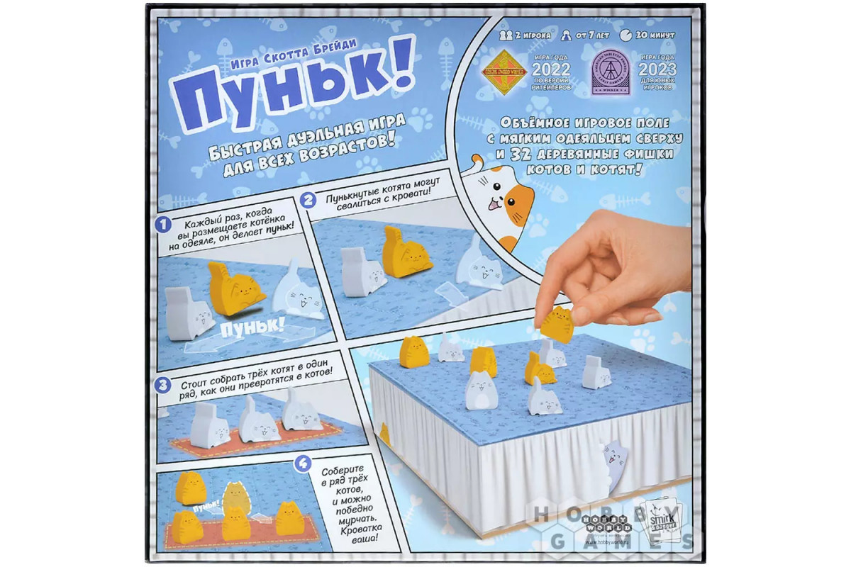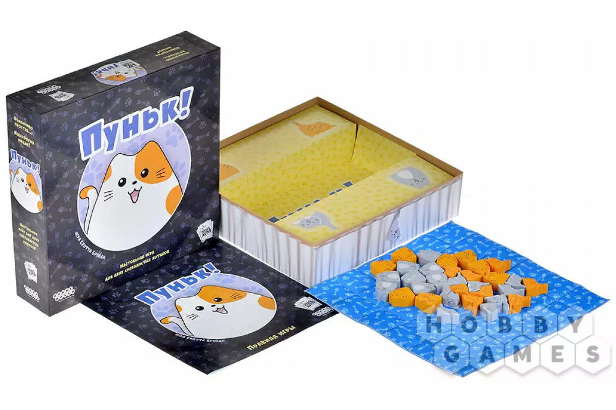 "Пуньк!" – это очаровательная дуэльная игра, которая покорит и детей, и взрослых. В коробке вас ждёт уютное игровое поле в виде стёганого одеяла и объёмные фигурки котят и котов. Главная цель – первым собрать ряд из трёх взрослых котов или разместить их всех ваших на мягком одеялке. Но будьте готовы к постоянным сдвигам и неожиданностям – каждый ход меняет расстановку сил! Игра сочетает простые правила с глубокой стратегией и дарит море веселья.