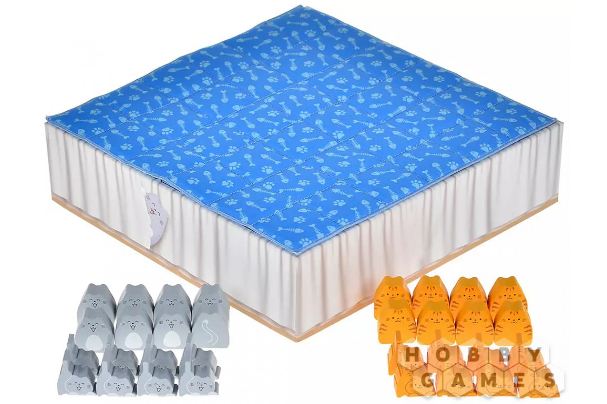 Переверните дно коробки и накройте его стёганым одеялом – это и будет ваша кровать. Ой, то есть, игровое поле! Выберите цвет котиков и возьмите все их фишки – 8 котят и 8 взрослых котов (последние пока что не будут вам доступны). Затем определите первого игрока, это будет очень просто: кто последним гладил кота, тот и первый!