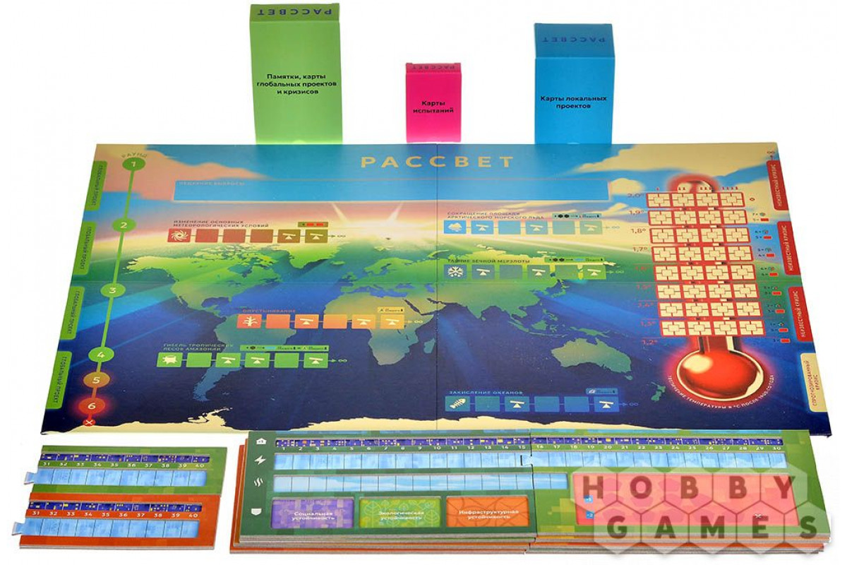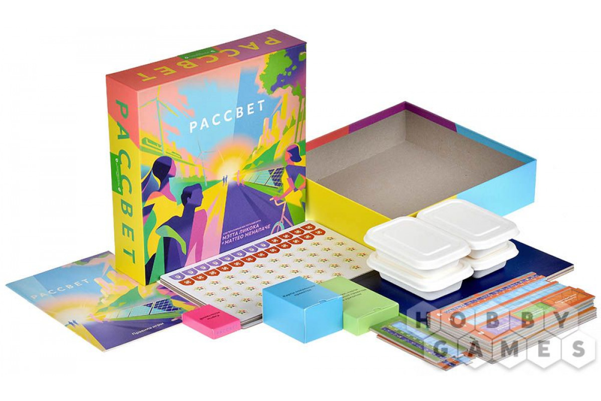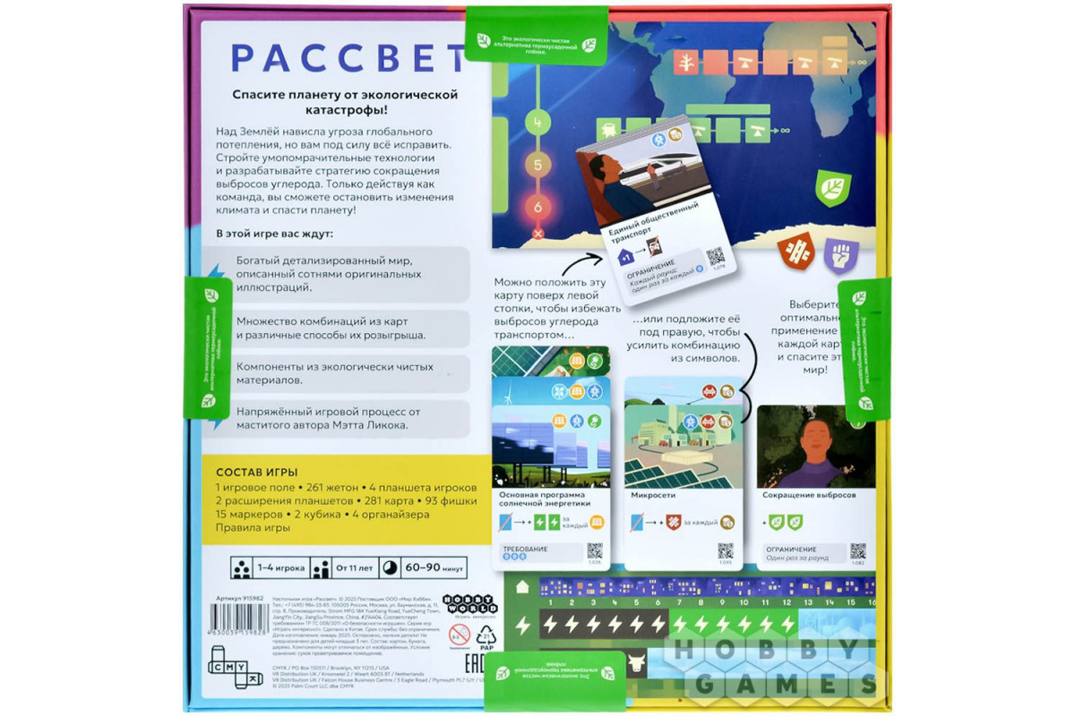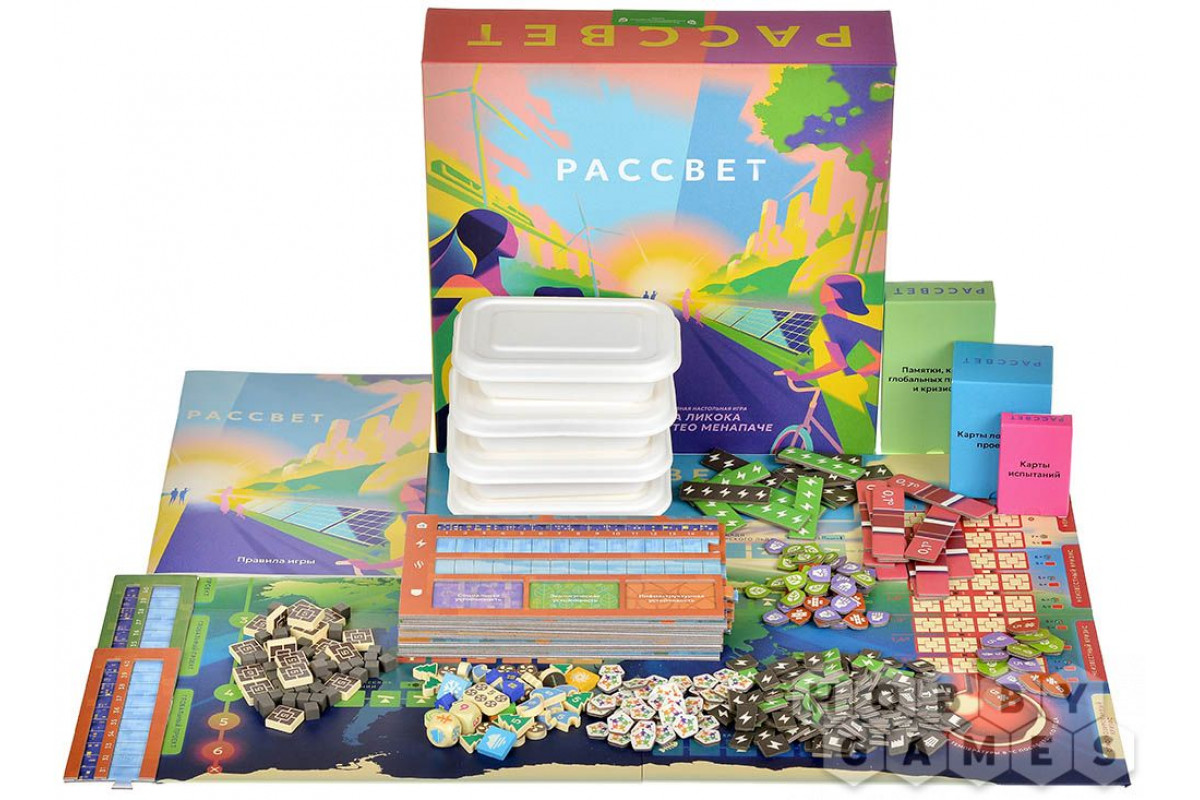 "Рассвет" – кооперативная стратегическая игра от Мэтта Ликока, создателя "Пандемии", в которой вы будете управлять мировыми державами и стремиться спасти планету от климатической катастрофы. От лица Китая, Европы, США или мирового большинства вы будете преследовать главную цель – сократить углеродные выбросы, прежде чем Земля перегреется или города охватит кризис. Игра очаровывает потрясающими иллюстрациями и компонентами из – разумеется! – экологически чистых материалов. Вас ждут мощная колода карт и сложные решения, где важно не только думать на два шага вперёд, но и помогать друг другу.