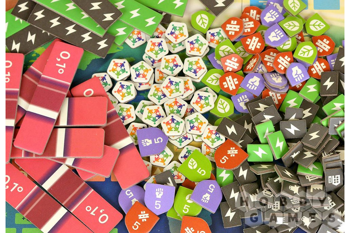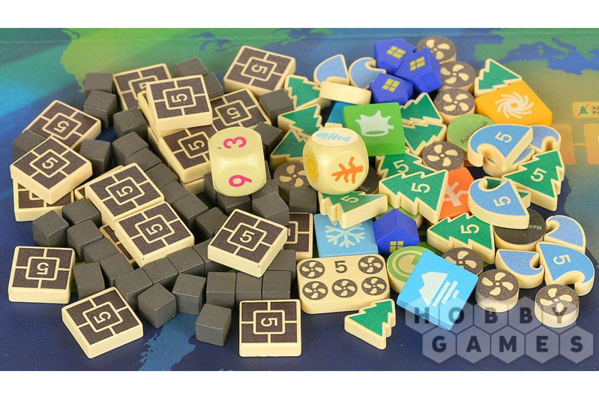В следующей фазе – – игроки считают, сколько углерода произвели за раунд, и пытаются нейтрализовать его при помощи деревьев, океанов и новых технологий. Всё, что нейтрализовать не удалось, повышает глобальную температуру. Если столбик термометра заполняется – на поле появляется жетон температуры, и игра становится сложнее, что вы в полной мере прочувствуете на следующем этапе.