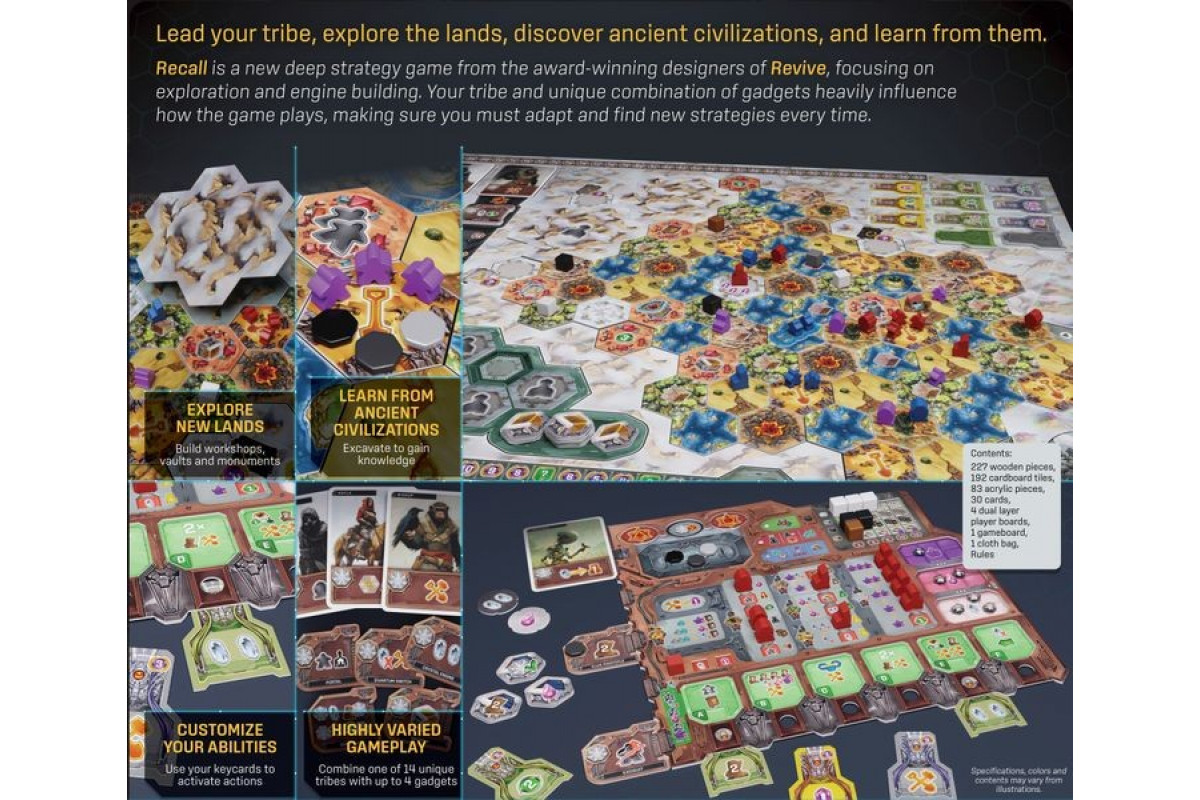 Recall is a deep strategy game from the designers of Revive that focuses on engine building and exploration. Each player begins the game with one of fourteen unique tribes and one of eighteen unique gadgets, both of which will heavily influence your strategy and opportunities. Throughout the game, you will lead your tribe, explore the lands, and discover traces of ancient civilizations to learn from them. On your turn, you either: