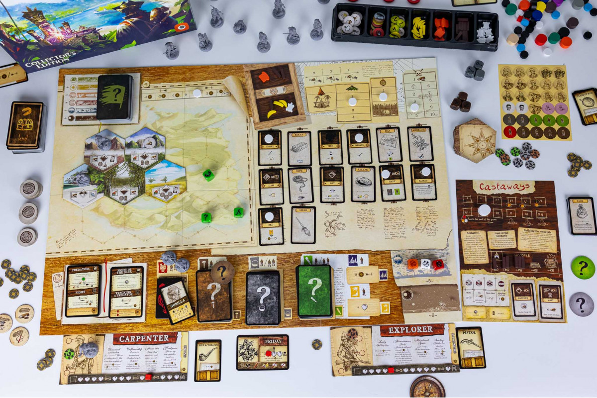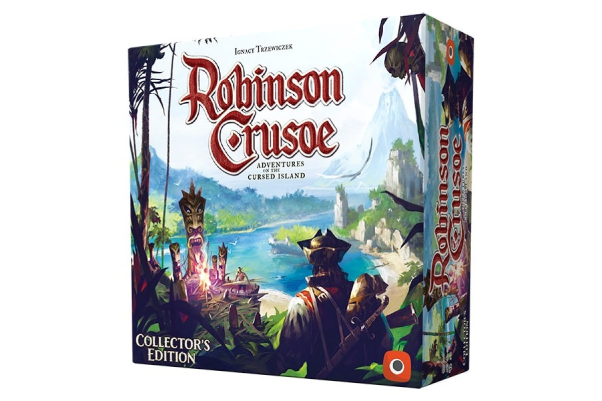 Collector's Edition of the game Robinson Crusoe: Adventures on the Cursed Island, a cooperative adventure game in which 1 to 4 players take on the roles of castaways trying to survive on a desert island. The Collector's Edition includes stunning minis, an open-and-play tutorial book, and a convenient plastic insert.
