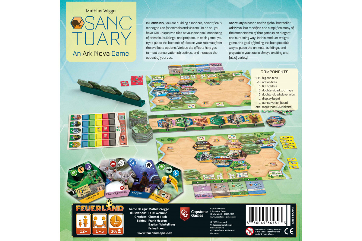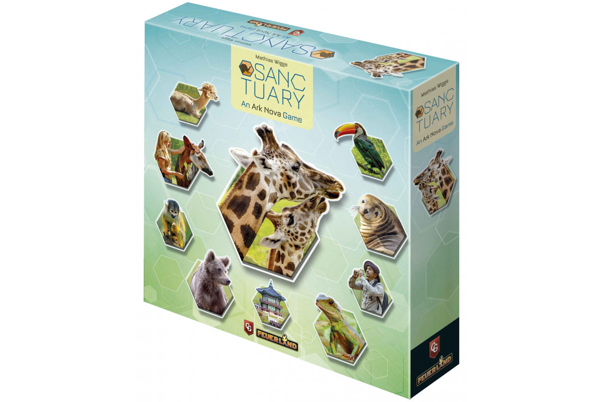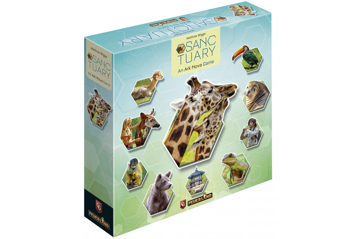 In Sanctuary, you build a modern, scientifically managed zoo. Support conservation projects and increase the appeal of your zoo. 135 unique tiles with animals, buildings and projects are at your disposal. Sanctuary is based on the best selling Ark Nova, but modifies and simplifies many of its mechanisms in an elegant and surprising way. The goal of placing the best mix of tiles on your zoo map from the available options keeps this medium-weight game exciting and full of variety.