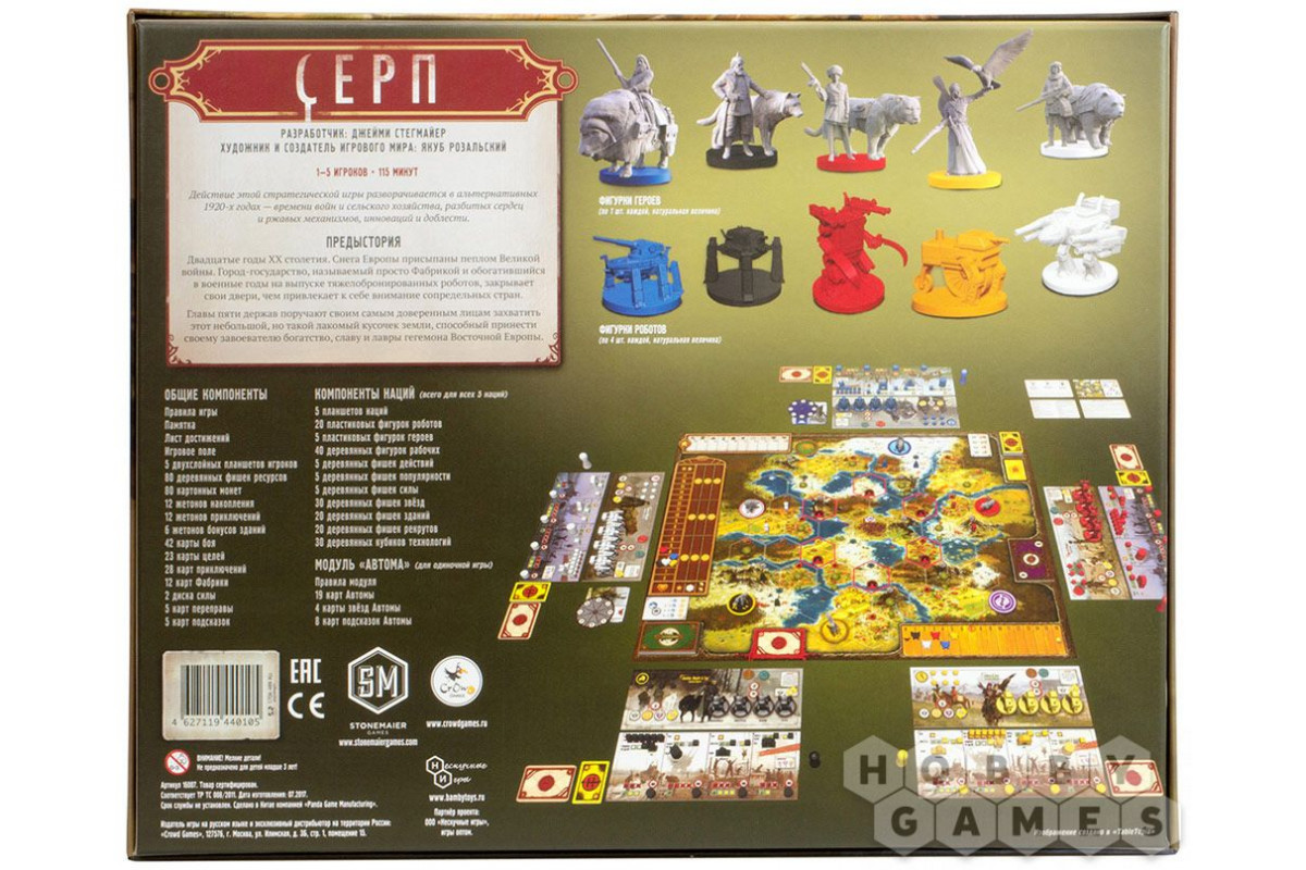 Первое, чем удивит и порадует игроков настольная игра "Серп" – обилие миниатюр, фишек и карточек. Всё это изобилие понадобится игрокам, чтобы выстроить великие империи из тех наций, которые в этой вселенной занимают территории Восточной Европы. В этом мире Первая мировая война шла особенно ожесточённо, это изменило менталитет и подход людей к войне. Теперь на поле брани правят огромные боевые шагоходы, которые поражают умы размерами, количеством средств уничтожения противника и креативным подходом к их выбору .