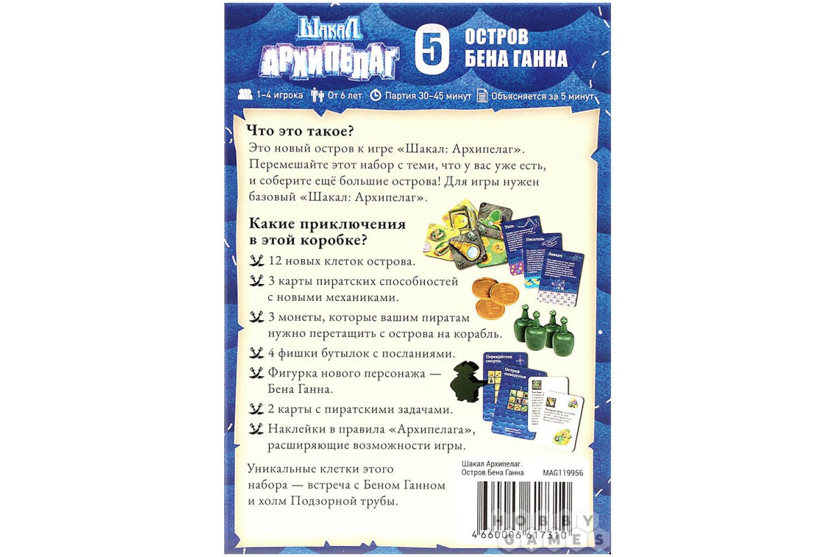 "Остров Бена Ганна" добавляет в игру новый остров. Смешайте дополнение с наборами, которые у вас уже есть, и соберите сушу ещё больших масштабов! Исследуйте новые клетки, встретьтесь с самим Беном Ганном, тащите сокровища на свой корабль и станьте самым удачным капитаном!