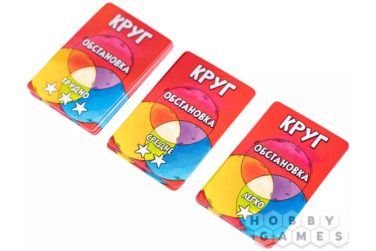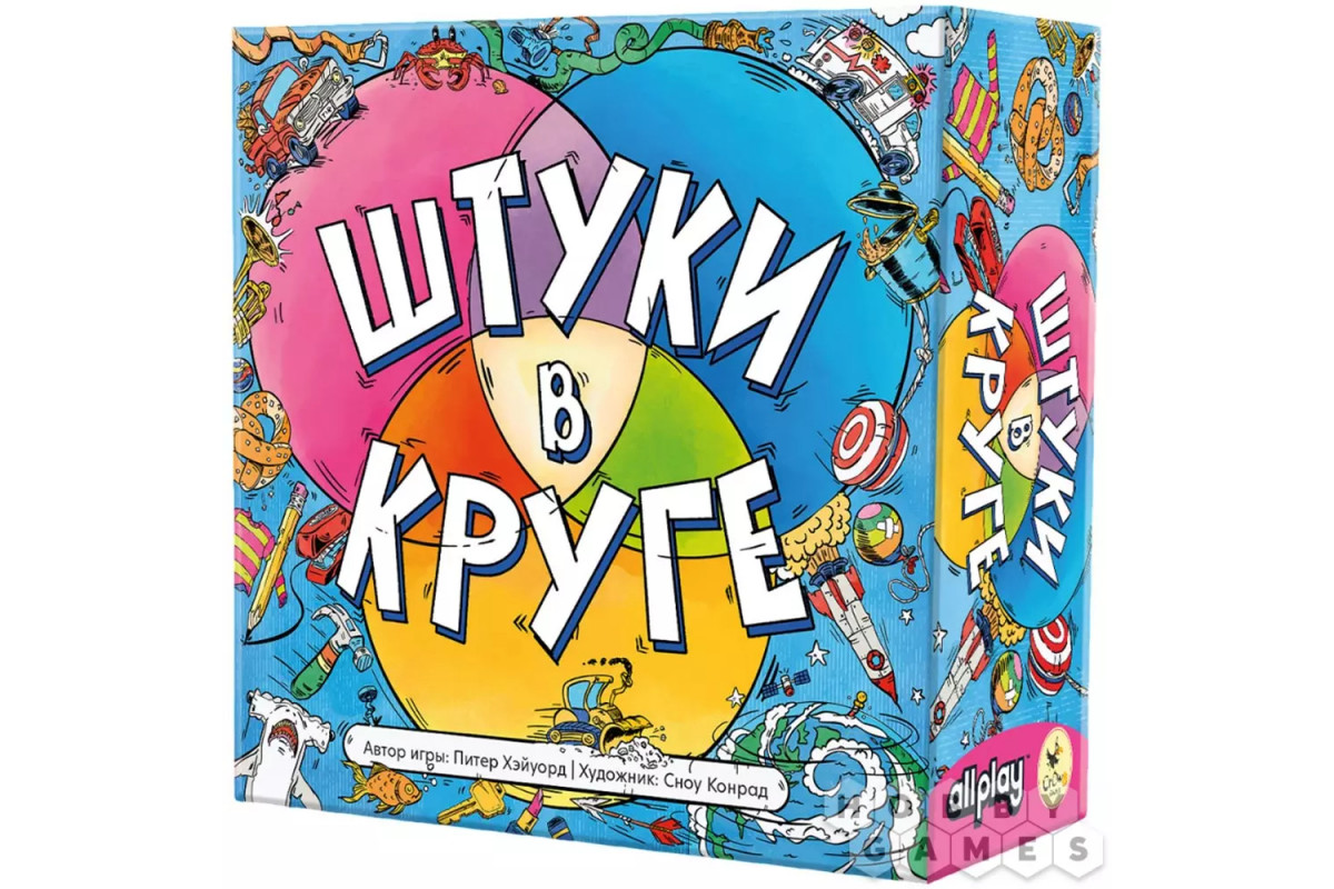 "Штуки в круге" – захватывающая игра, где улыбки соседствуют с подозрительными взглядами, а догадки рождаются быстрее, чем вы успеваете их озвучить. В центре игры – три круга, и каждому из них соответствует своё секретное правило, известное только одному игроку. Цель игроков – избавиться от своих карт, выкладывая их в круги или их пересечения и проверяя свои догадки. Попали в цель – ходите снова. Ошиблись – тянете новую карту. Всё строится на наблюдательности: чем внимательнее следите за чужими ходами, тем быстрее сможете решить головоломку!