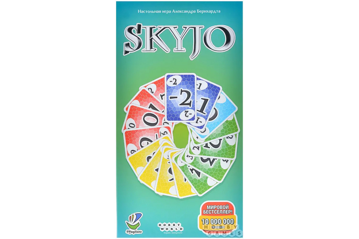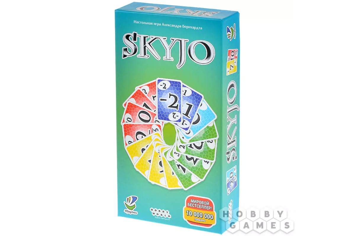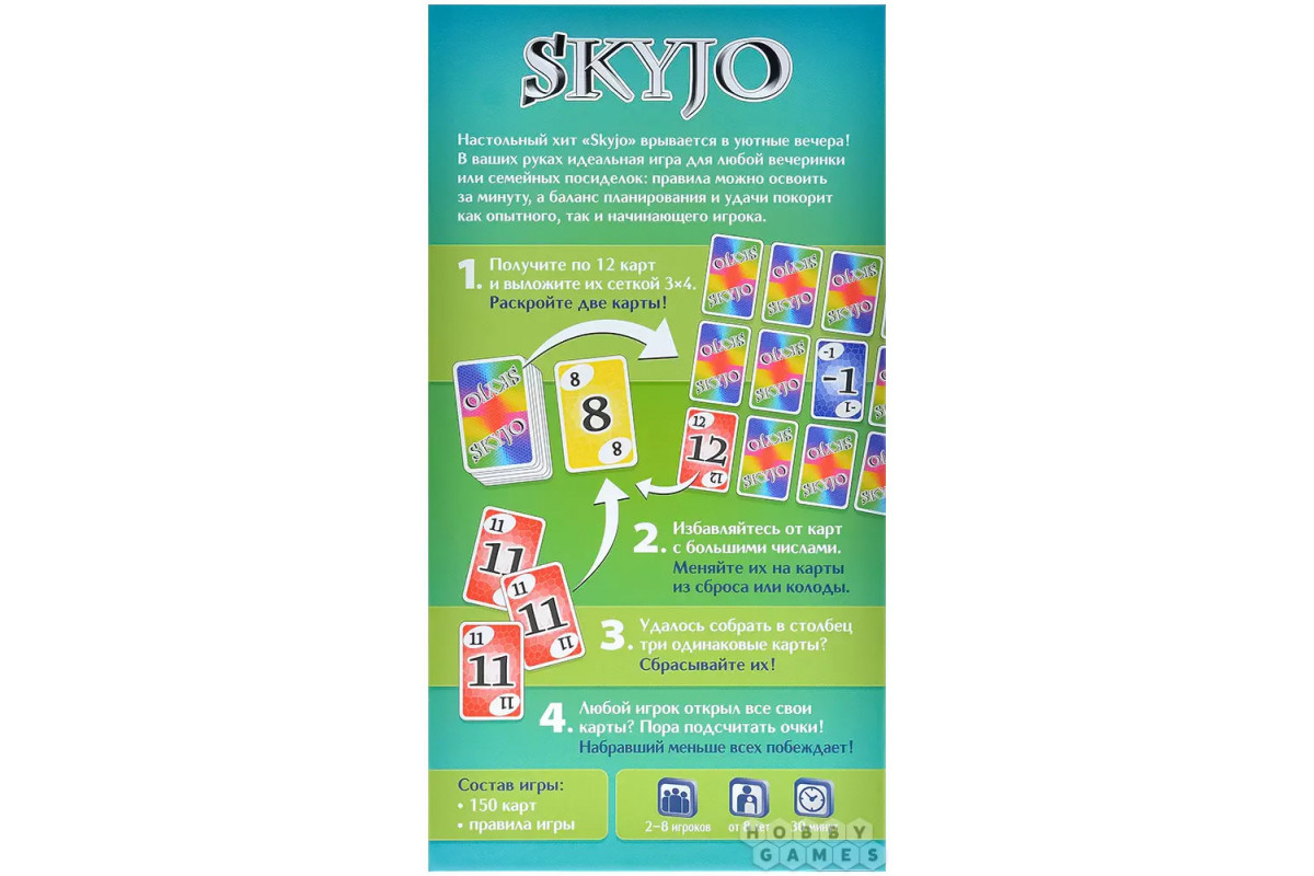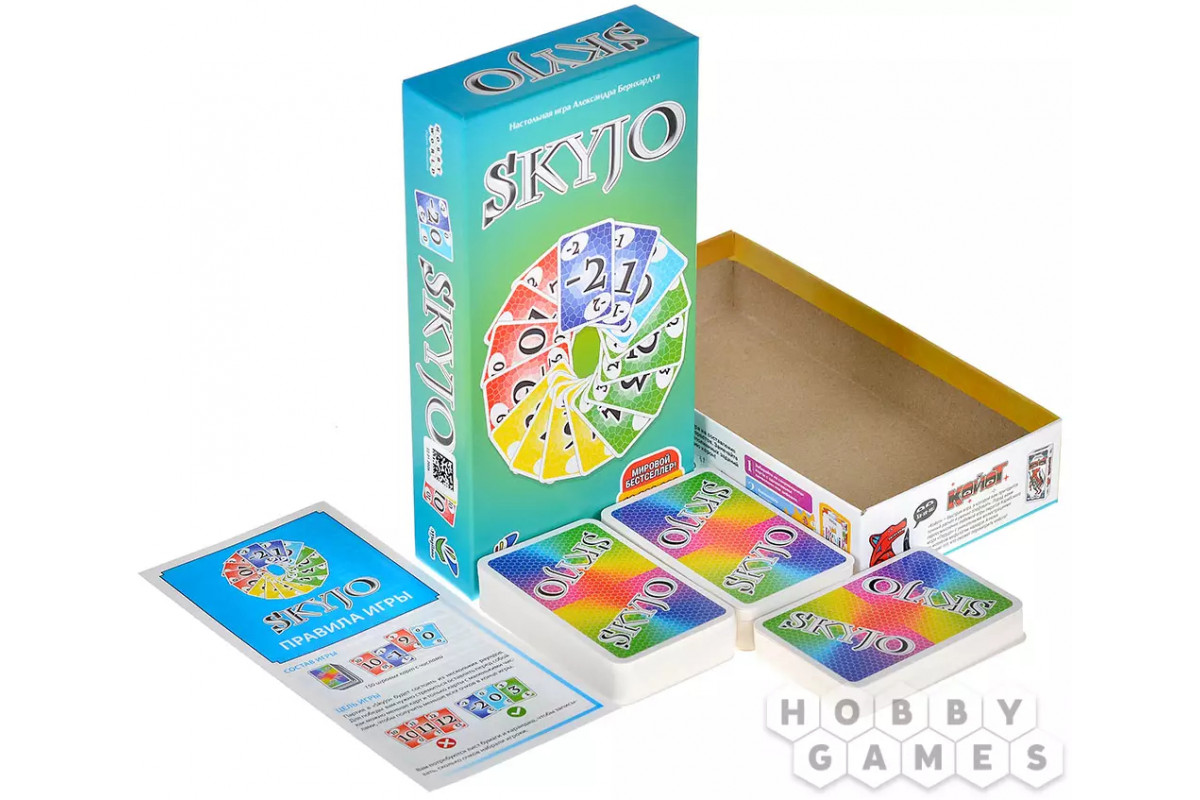 Skyjo – динамичная настольная карточная игра с простыми правилами, которые осваиваются буквально за минуту. При этом в игре удачно сочетаются расчёт и элемент удачи, поэтому она одинаково увлекает и тех, кто только знакомится с настолками, и более опытных игроков.