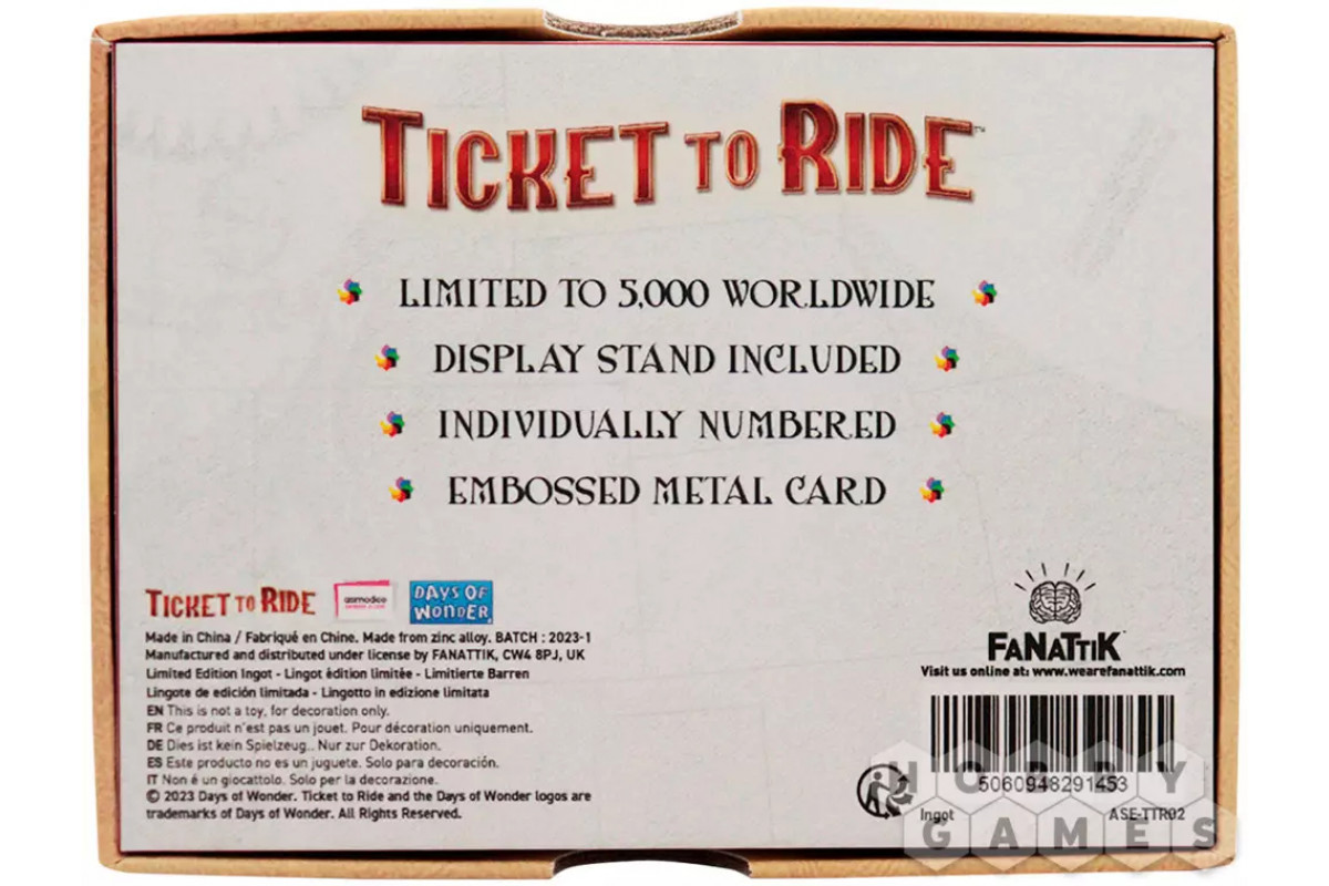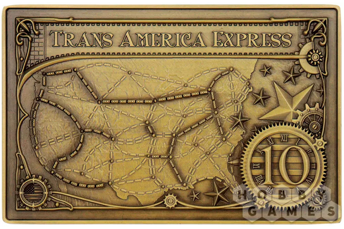 Ваша империя заслуживает достойной награды! Получите слиток Trans America Express и добавьте к своим достижениям 10 заветных очков за самый длинный непрерывный маршрут. Этот металлический слиток – материальное воплощение вашего железнодорожного триумфа в игре . Исполненный с ювелирным вниманием к деталям, он украшен изысканным рельефным тиснением. Тираж ограничен всего 5 000 экземплярами по всему миру, а уникальный номер делает слиток по-настоящему ценной находкой для коллекционеров. Стильная презентационная коробка с подставкой позволит ему занять почётное место в вашей коллекции как символ очередного покорённого маршрута!