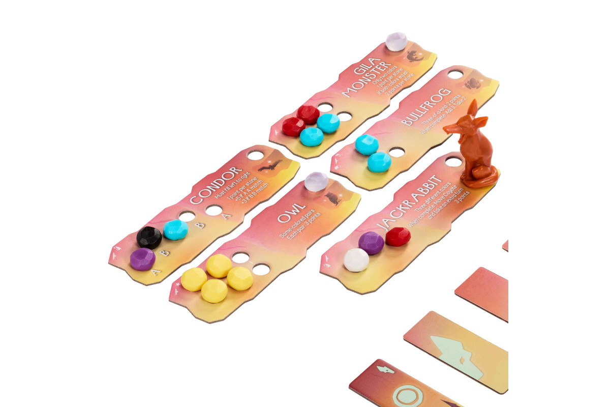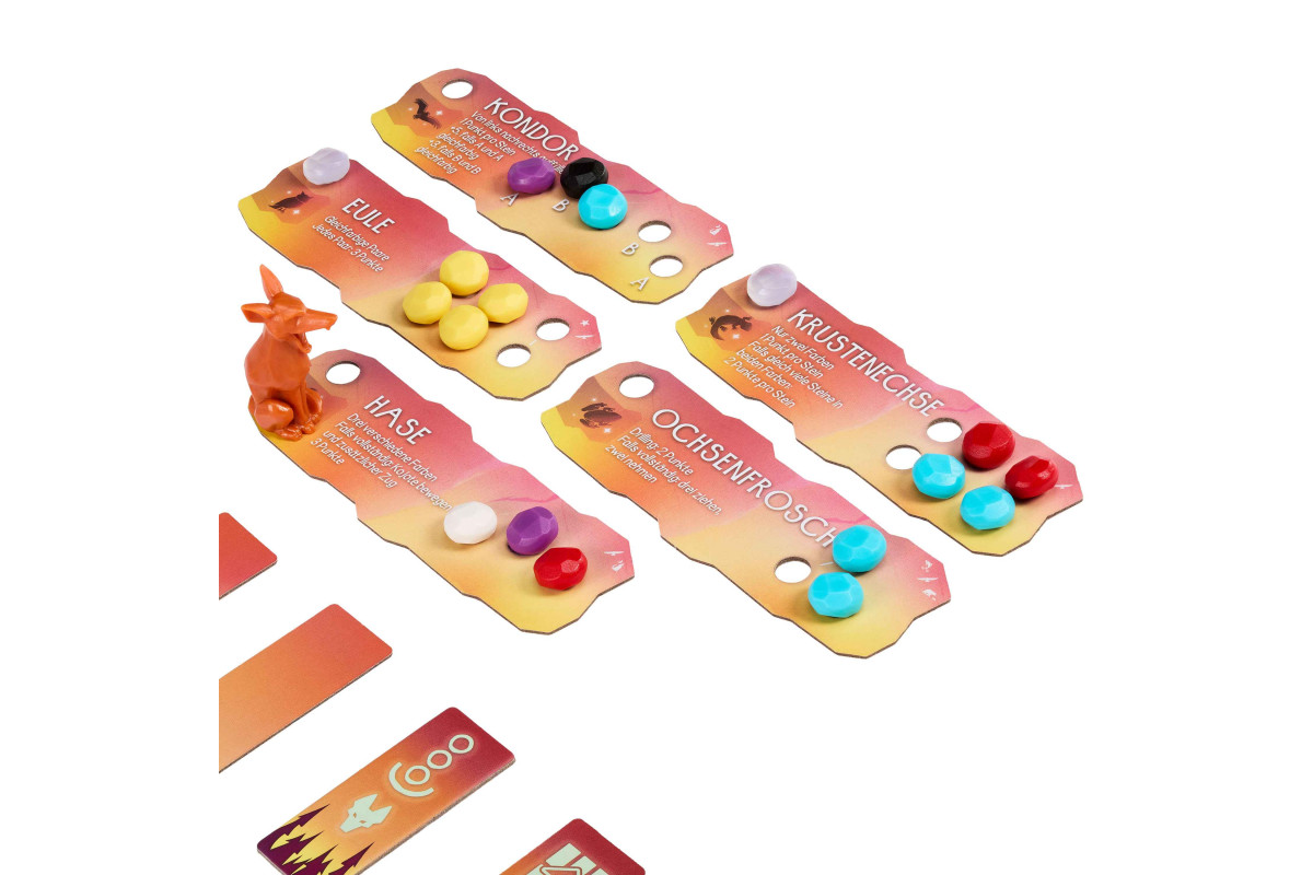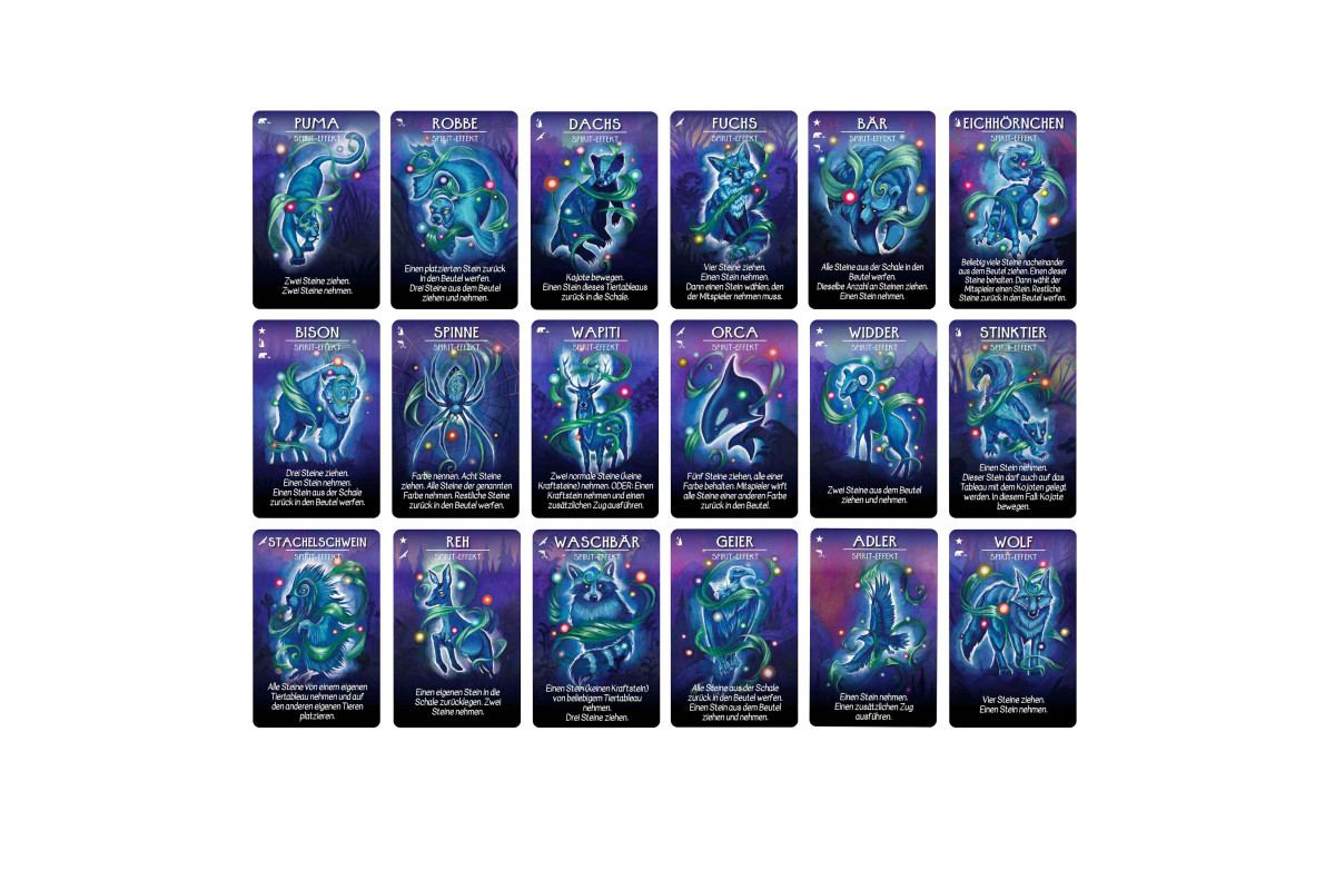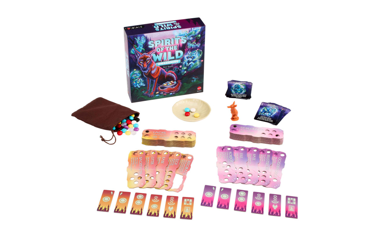 Spirits of the Wild: Awakening ist ein wunderschön gestaltetes Brettspiel für 2 Spieler, bei dem bunte Steine gesammelt werden. Mithilfe von Aktionssteinen und den Kräften magischer Aktionskarten ziehen die Spieler die Steine aus dem Aufbewahrungsbeutel in eine Schale und dann weiter zu ihren Tierspielbrettern. Bei jedem Tier müssen die Steine auf eine andere Art gesammelt und angeordnet werden, um die maximale Punktzahl zu erzielen. Wer am Spielende die meisten Punkte hat, gewinnt.