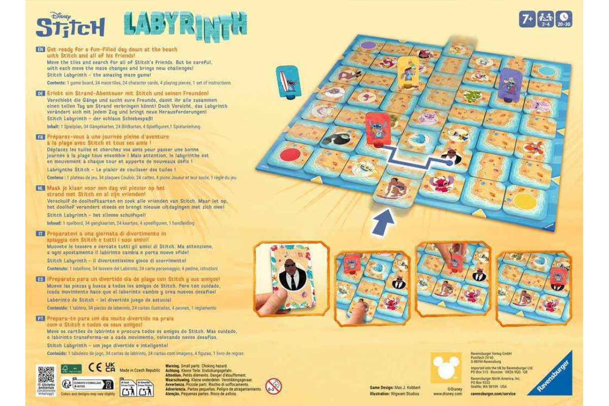 "Ein unvergesslicher Spieleabend mit Stitch für die ganze Familie: Das beliebte Schiebespiel mit den geliebten Charakteren aus Lilo & Stitch begeistert kleine und große Fans gleichermaßen. In diesem Brettspiel für 2-4 Personen ab 7 Jahren wählen alle Personen eine Stitch-Spielfigur. Ziel ist es, durch geschicktes Verschieben der Wege im Labyrinth zu Stitchs Alienfreunden zu gelangen. Wer als erstes alle gesuchten Figuren findet, gewinnt das Spiel!"