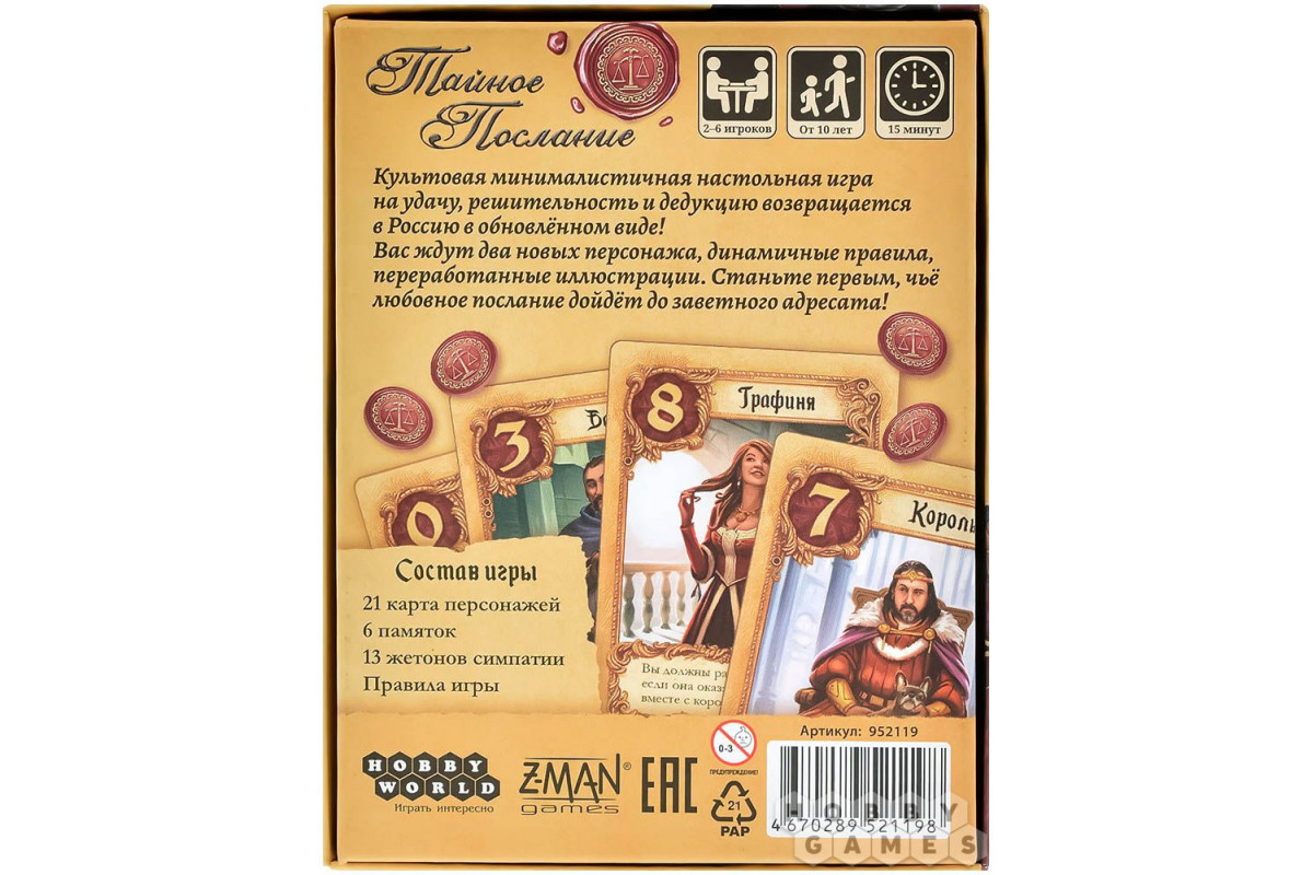 "Тайное послание" – это динамичная карточная игра на удачу, лёгкую стратегию и дедукцию. Ваша цель – первым доставить любовное послание принцессе и завоевать её сердце. Механика проста, но увлекательна: вы будете использовать карты персонажей с уникальными способностями, чтобы перехитрить соперников и набрать как можно больше жетонов симпатии прекрасной дамы.