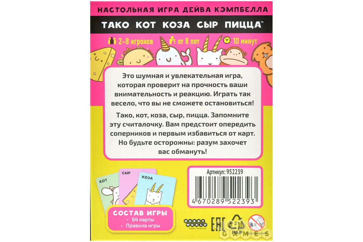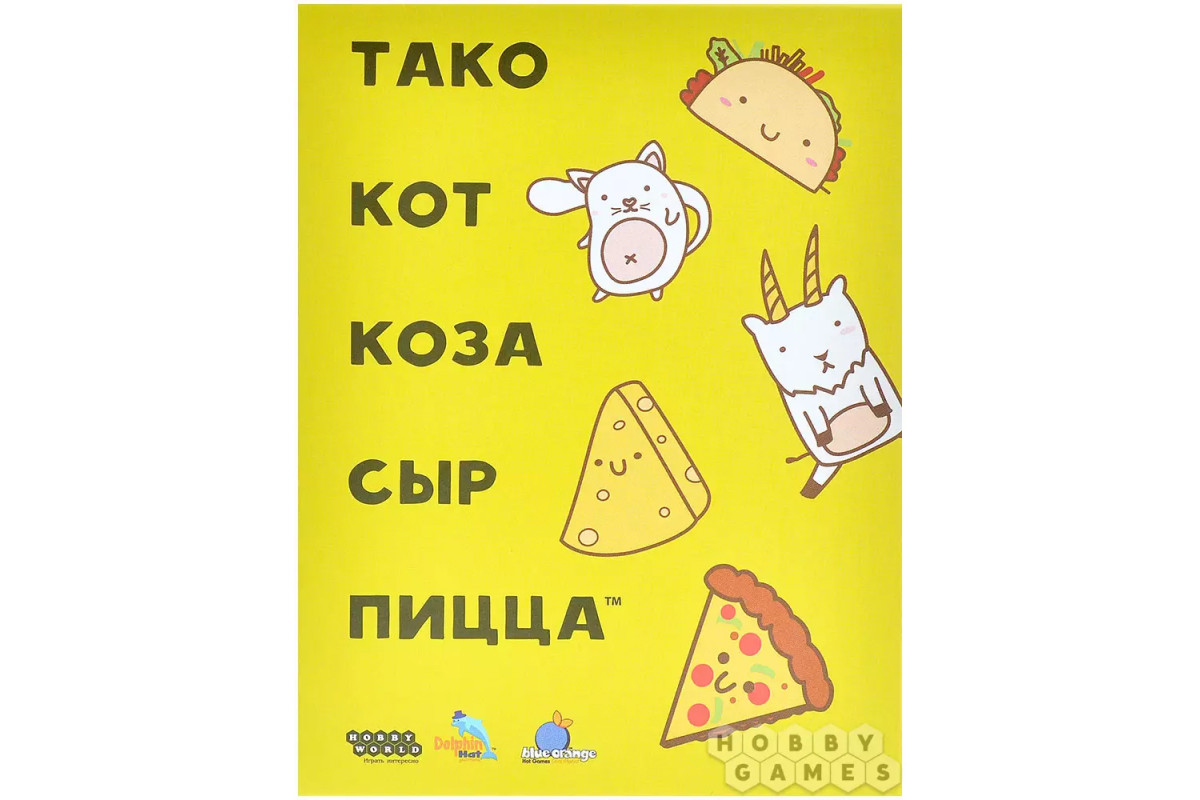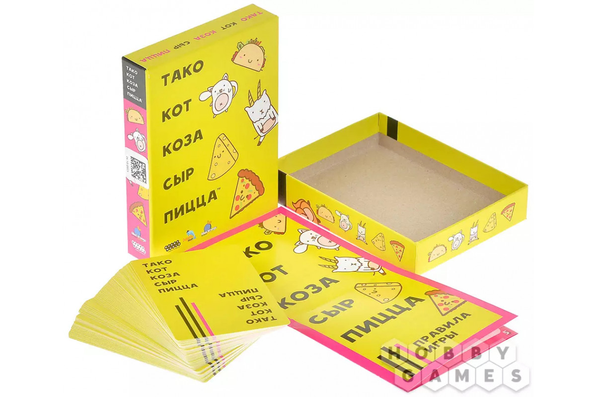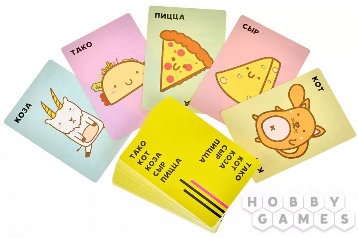 В этой игре вам придется выкладывать на стол карты, произнося вслух слова "тако, кот, коза, сыр, пицца", вне зависимости от того, что будет изображено и написано на картах. А также нужно будет делать определенные действия, если в игре появились особые карты: горилла, сурок или нарвал.