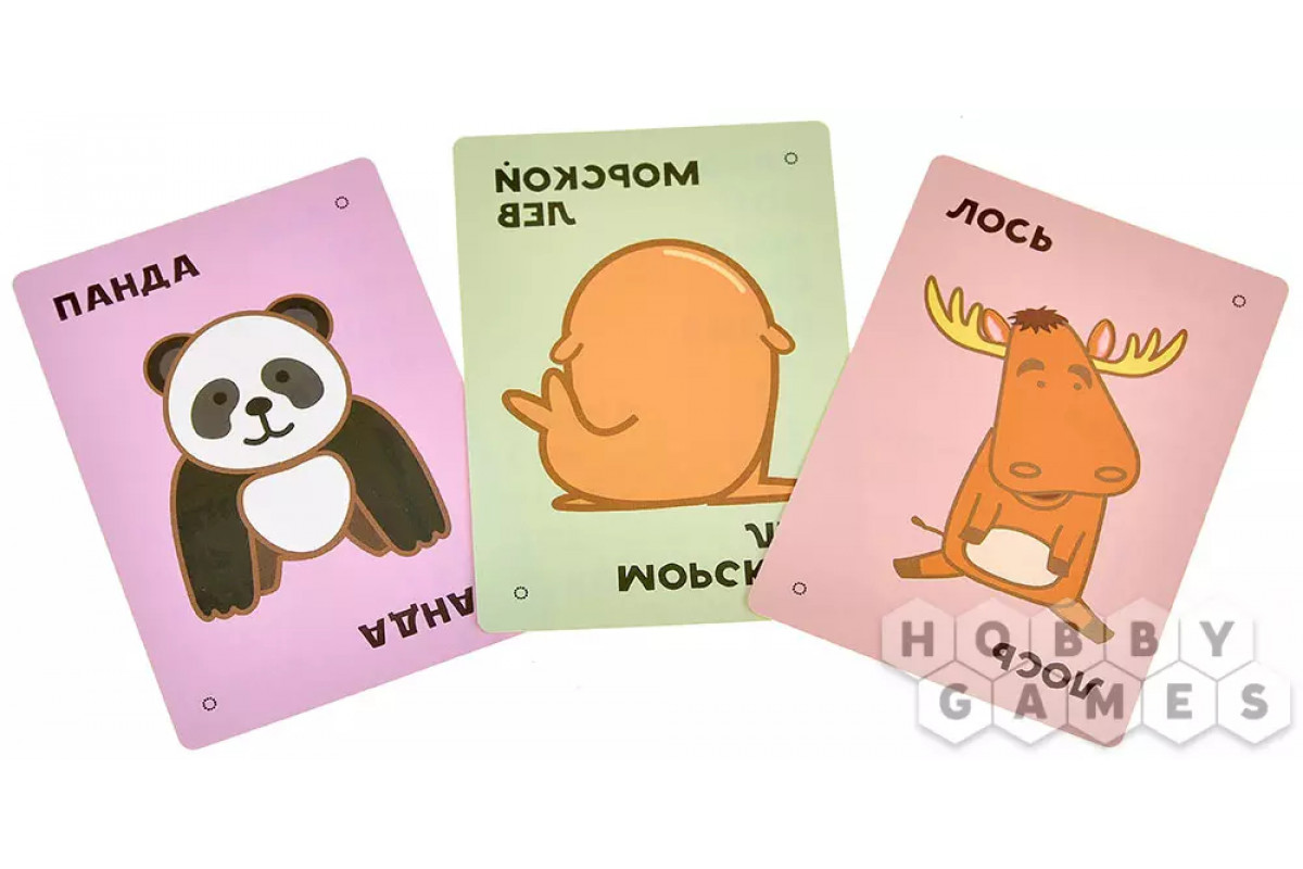 Что же нового принесла нам именно эта коробка? Тут вы не найдёте, как в прошлый раз, сурка, гориллу и рогатого нарвала. Вместо них в колоде с картами притаились новые герои: панда, лось и морской лев! В тот момент, когда открывается карта с таким персонажем, нужно перед тем, как накрыть колоду, сделать определённый жест руками, например, погладить себя по животу, изобразить рога над головой или хлопнуть два раза в ладоши.