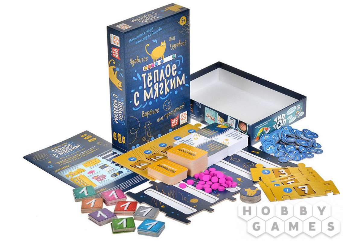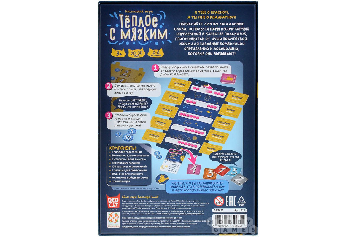 "Тёплое с мягким" – это динамичная вечериночная игра, где каждый по очереди становится ведущим и объясняет загаданное слово, используя планшет с дисками и пары противоречивых, часто не имеющих ничего общего определений. Чем абсурднее подсказки — тем интереснее! Игроки должны угадать слово, ориентируясь на ассоциации ведущего. Конечно же, самые проницательные получают победные очки! В игре два режима: в соревновательном каждый из вас борется за лидерство, а в кооперативном вы действуете сообща, чтобы проверить, насколько хорошо понимаете друг друга. Смешные провалы, неожиданные озарения и бурные обсуждения гарантированы!