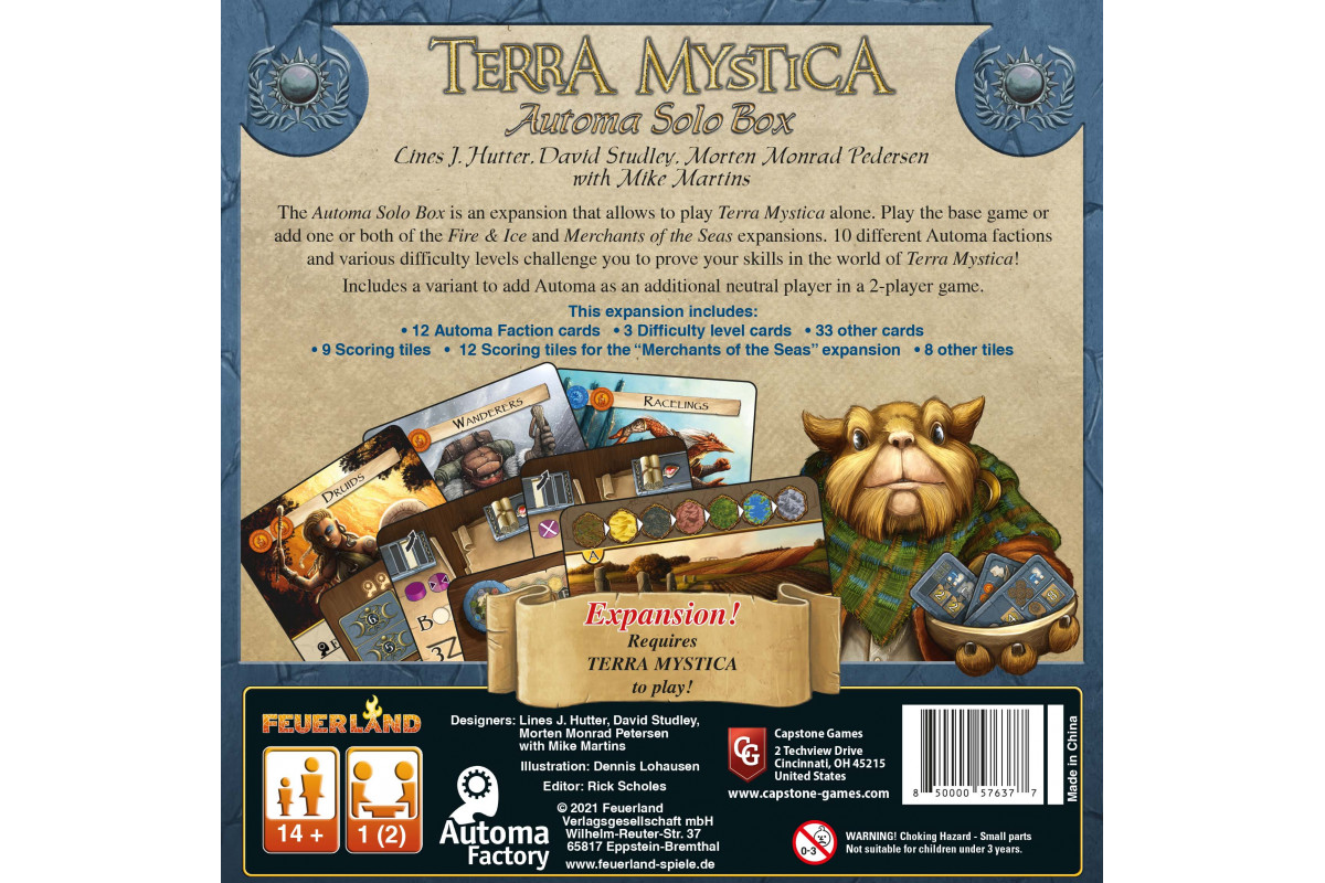 Mit dieser Erweiterung lässt sich Terra Mystica auch alleine gegen einen virtuellen Gegner (Automa) spielen. 10 verschiedene Automavölker stehen zur Auswahl. Alternativ könnt ihr den Automa auch als zusätzlichen Gegner in eine Partie mit 2 Spielern aufnehmen. Diese Erweiterung ist voll kompatibel mit den bisherigen Erweiterungen. Zum Spielen wird das Grundspiel benötigt.