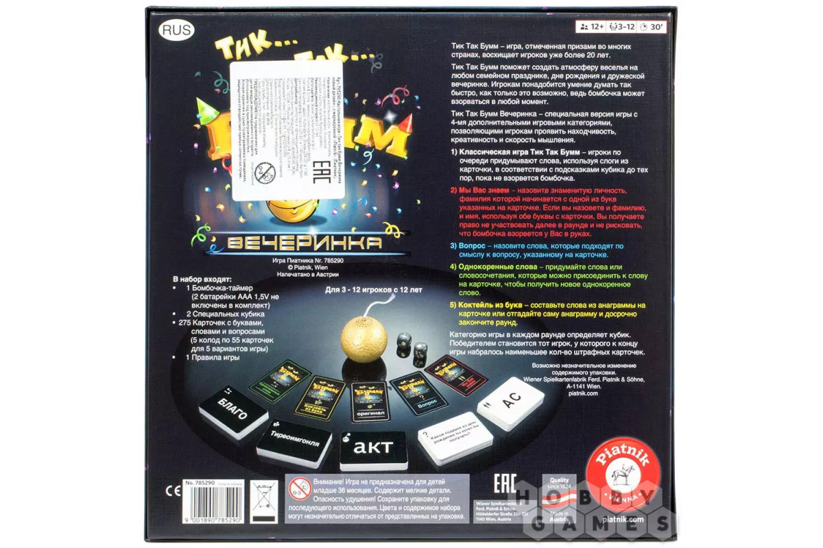 Настольная игра "Тик-так Бумм" широко известна среди игроков разного возраста, она получила престижную награду в 1996 году как лучшая семейная игра, но радует игроков по всему миру и по сей день! В этой специальной версии игры – "Вечеринка" – игра становится ещё более увлекательной и интересной!