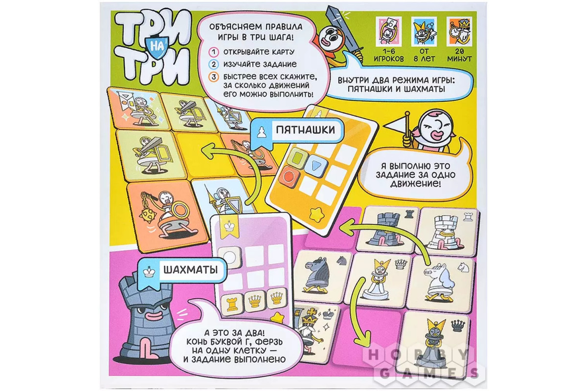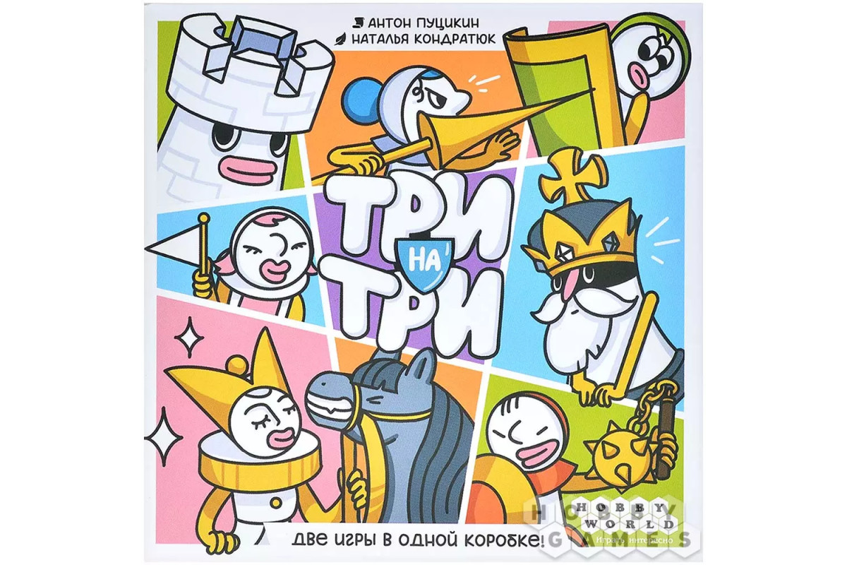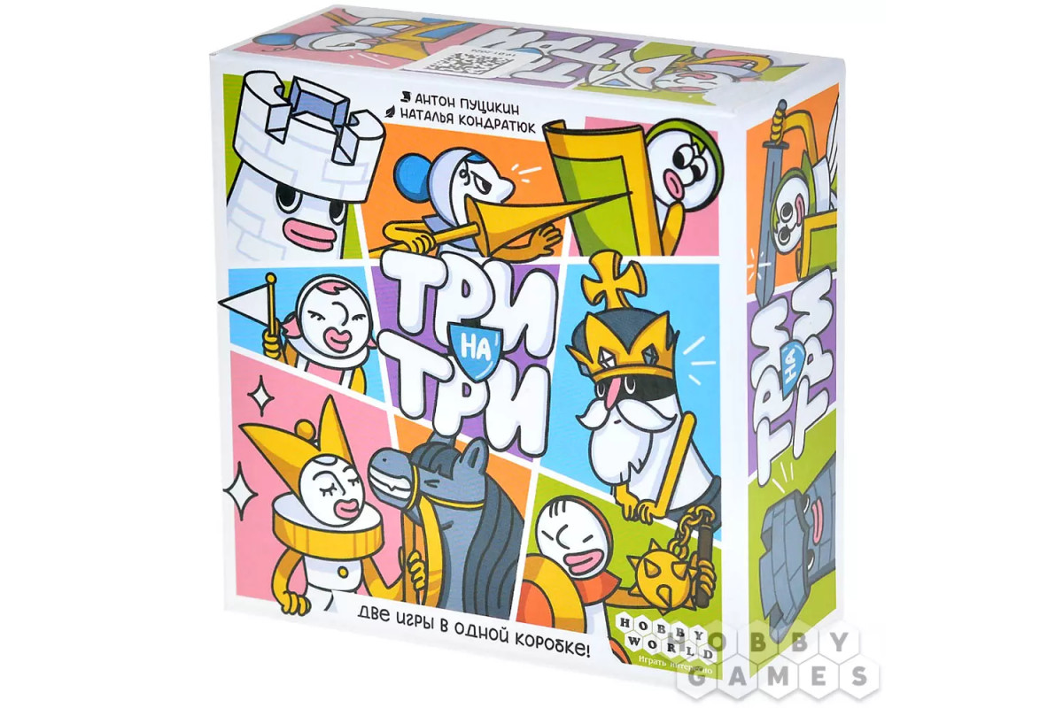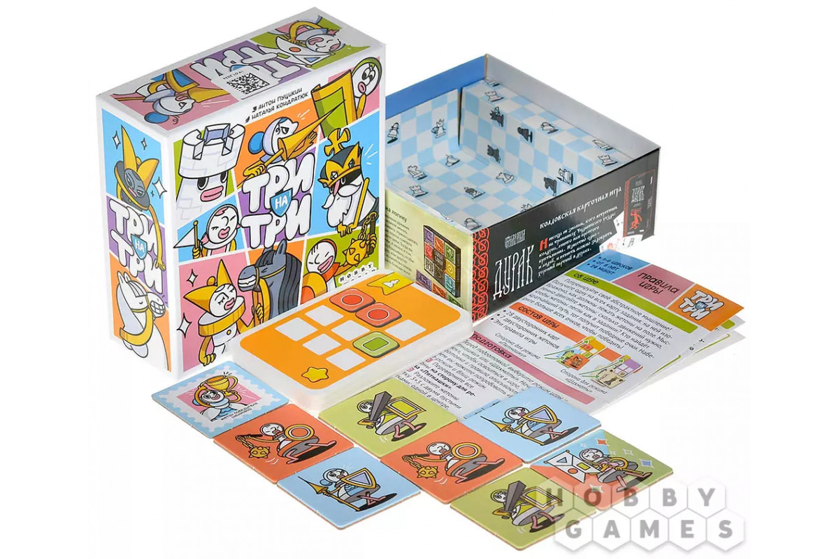"Три на три" – это динамичная игра на абстрактное мышление и скорость реакции. Все игроки одновременно решают одно и то же задание, стараясь как можно быстрее привести игровое поле 3x3 в нужное состояние. Каждая карта показывает цель раунда – определённое расположение жетонов, которое нужно воспроизвести в голове, следуя правилам выбранного режима.