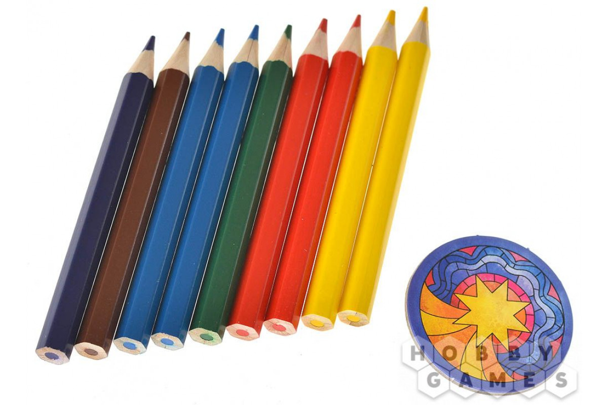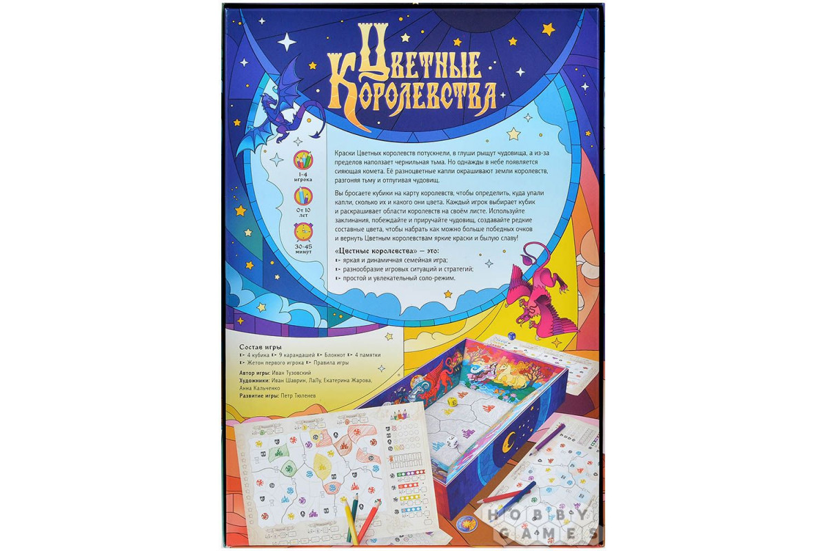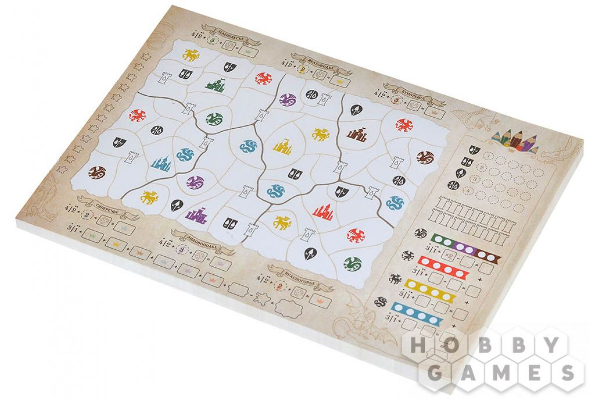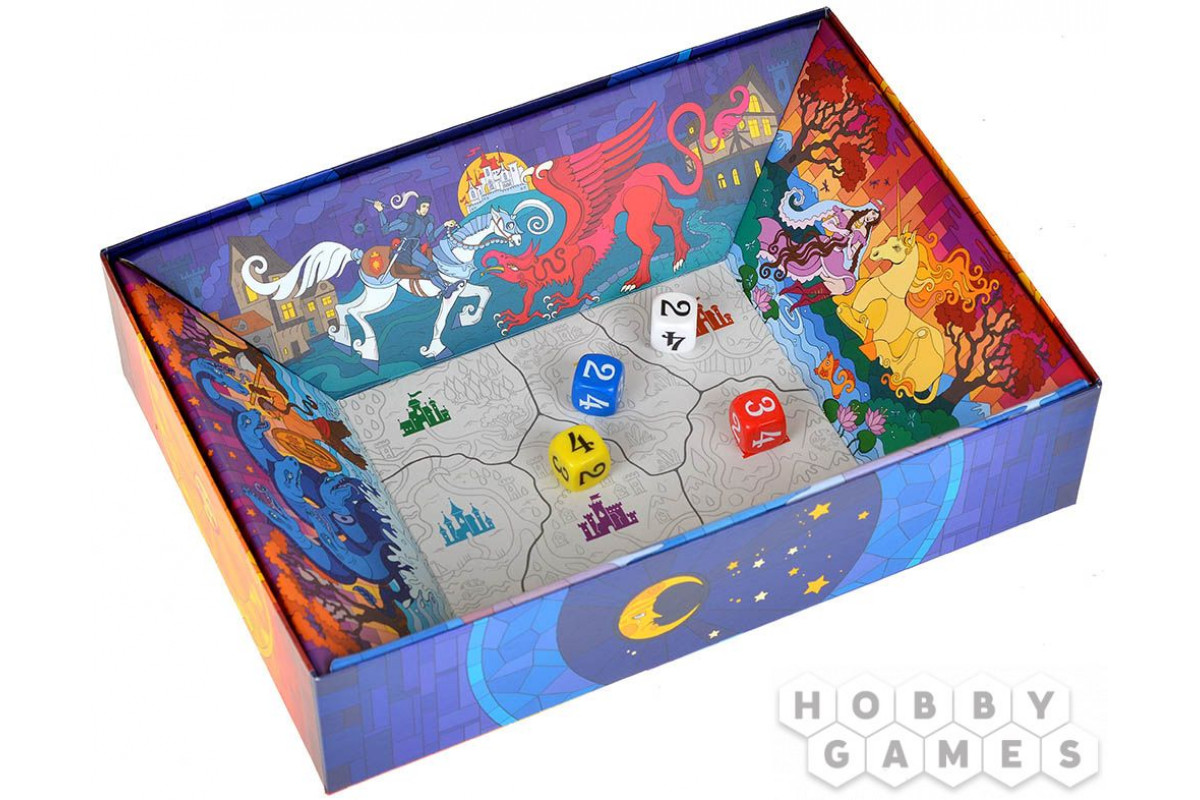 Игровое поле встроено прямо в коробку, так что, бросая кубики, вам не придётся переживать, что они разлетятся во все стороны. Раскрашивать королевства на своей карте – сплошное удовольствие, тем более, что яркие карандаши уже идут в комплекте. Продумывайте ходы, чтобы создать редкие составные цвета и набрать как можно больше победных очков и вернуть королевствам былую славу!