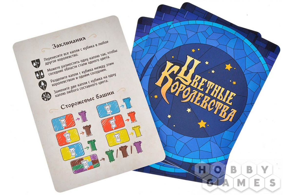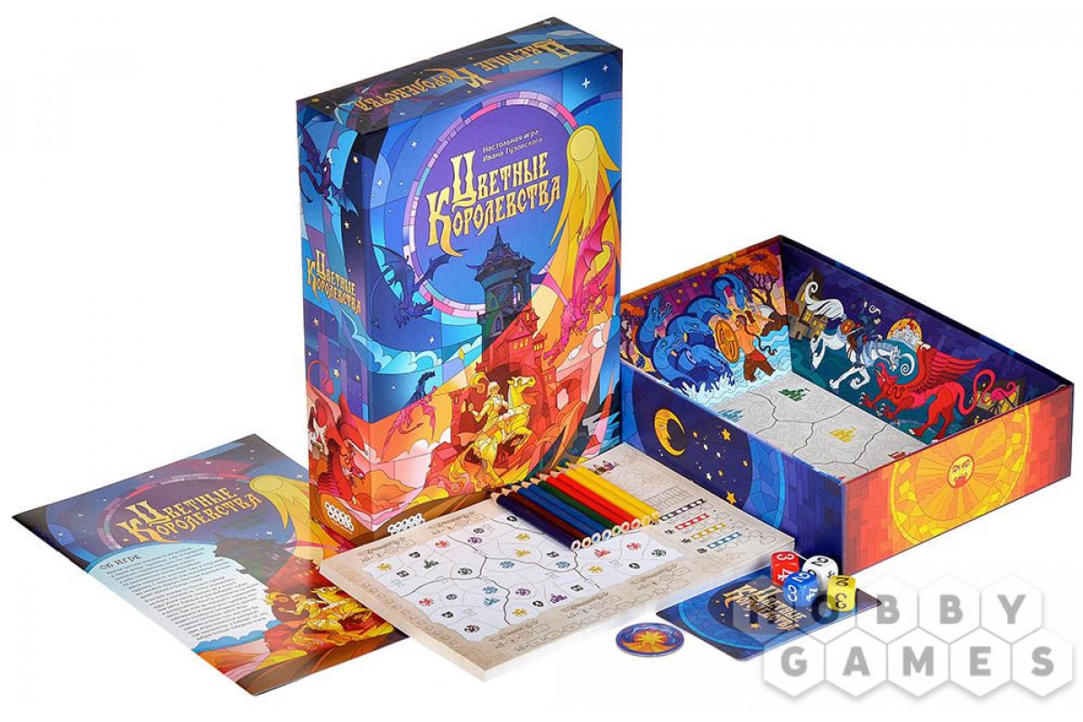 "Цветные королевства" – это яркая настольная игра для всей семьи, в которой вам предстоит бросать кубики и раскрашивать королевства в яркие цвета. Дабы вернуть землям прежнюю красоту, придётся столкнуться с чудовищами, которых можно как одолеть в бою, так и приручить. А помогать в этом вам будут различные заклинания! Большое разнообразие стратегий и игровых ситуаций позволит каждому игроку найти свой путь для достижения победы.