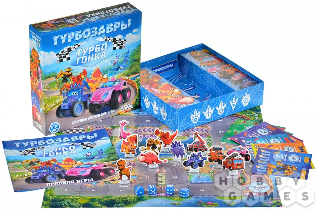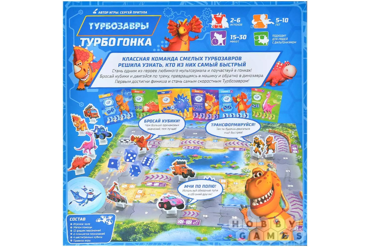 "Турбозавры: Турбогонка" – динамичная настольная игра для детей по мотивам популярного мультсериала. Игроки выбирают любимого персонажа, бросают кубики и мчатся по трассе, превращаясь из динозавра в машину и обратно. Каждый поворот может стать решающим: короткие пути, смена формы и правильное использование кубиков приближают вас к победе. Игра развивает внимание, счёт и умение принимать решения, а яркое оформление и знакомые герои делают каждую партию весёлым приключением для всей семьи!