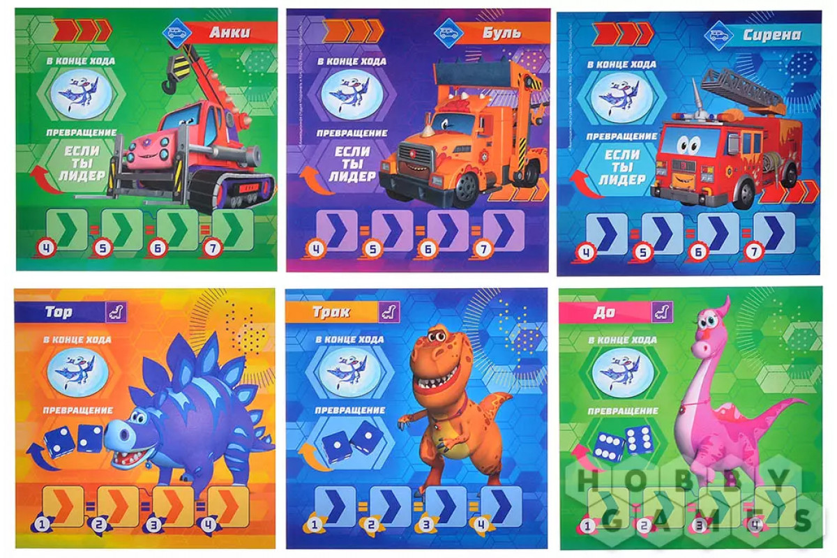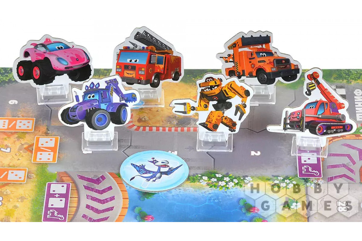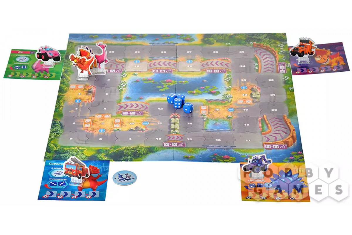 Если на планшете игрока есть нужные значения, Турбозавр трансформируется в машинку и мчится быстрее, оставляя соперников позади. В конце хода, если фигурка игрока становится лидером, она снова превращается в Турбозавра. На поле встречаются фиолетовые и оранжевые срезы, мосты и грунтовые дороги, требующие точных комбинаций кубиков, чтобы использовать их преимущества. Каждый ход – это баланс между риском и скоростью, ведь неправильное решение может стоить вам лидерства!