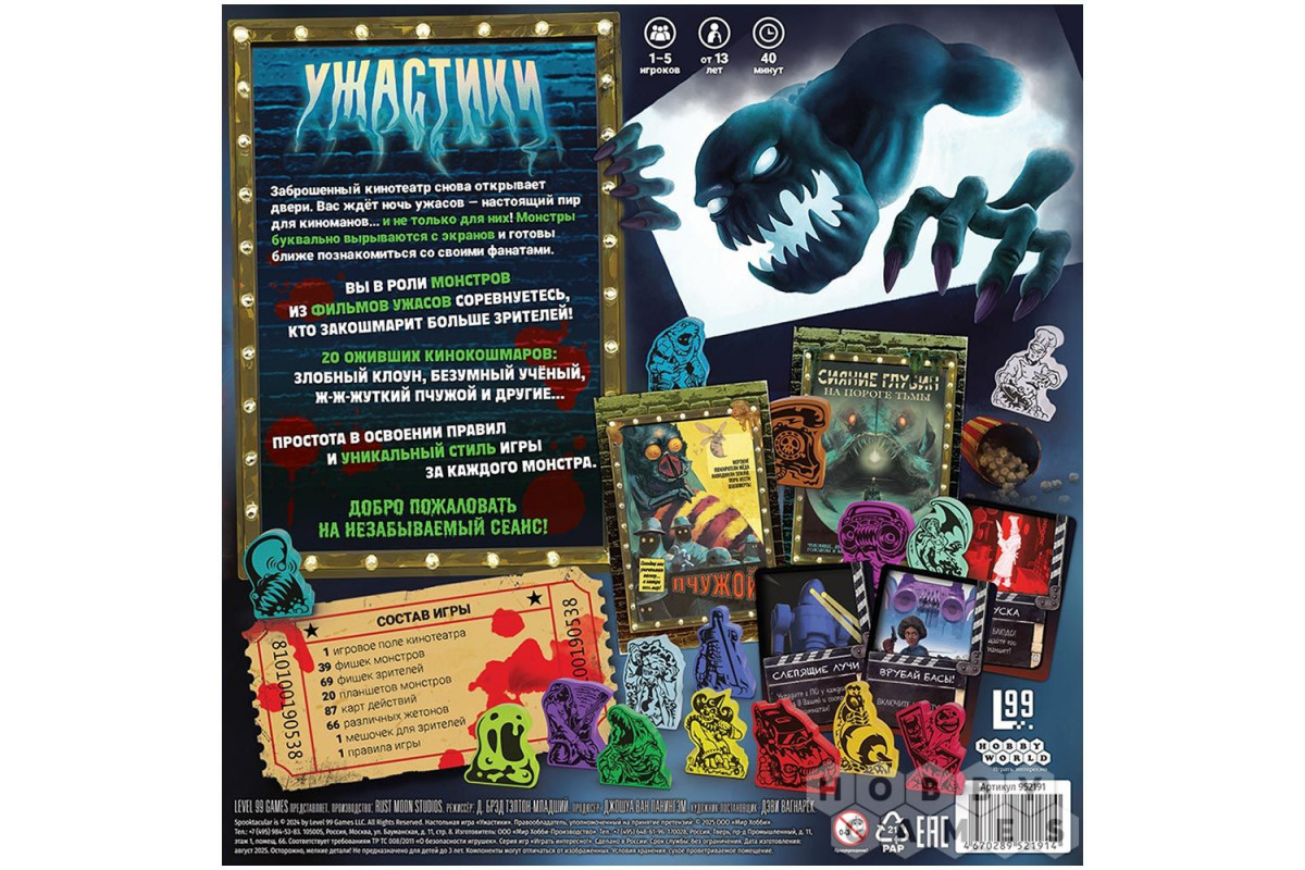 "Ужастики" – это весёлая и динамичная настольная игра, в которой вы примерите роль одного из двадцати оживших кинокошмаров. Ваша цель – напугать как можно больше зрителей и доказать, что именно вы – главная звезда этого хоррор-фестиваля! Выбирайте своего уникального монстра и используйте его особые способности, чтобы обойти соперников. Простые правила позволяют сразу погрузиться в хаотичную и весёлую гонку за зрителями, где всё решает ваша тактика и немного везения. Идеальный выбор для дружеской посиделки, которая подарит море эмоций и смеха.