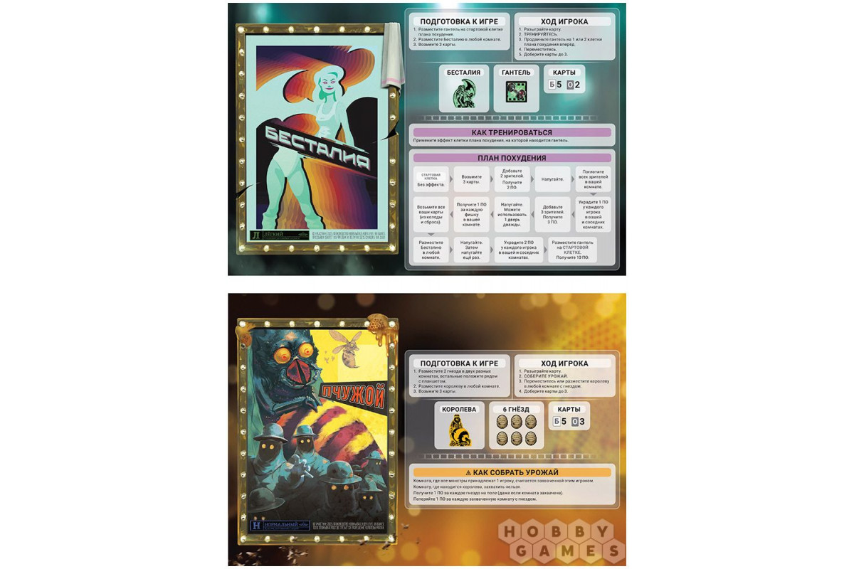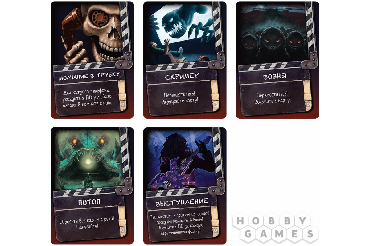 Выберите одного из двадцати монстров и получите его персональный планшет с особыми способностями. Ваша главная задача – сеять панику среди зрителей, накапливая победные очки (ПО) через запугивание и хитрые комбинации. Каждый ход вы будете: