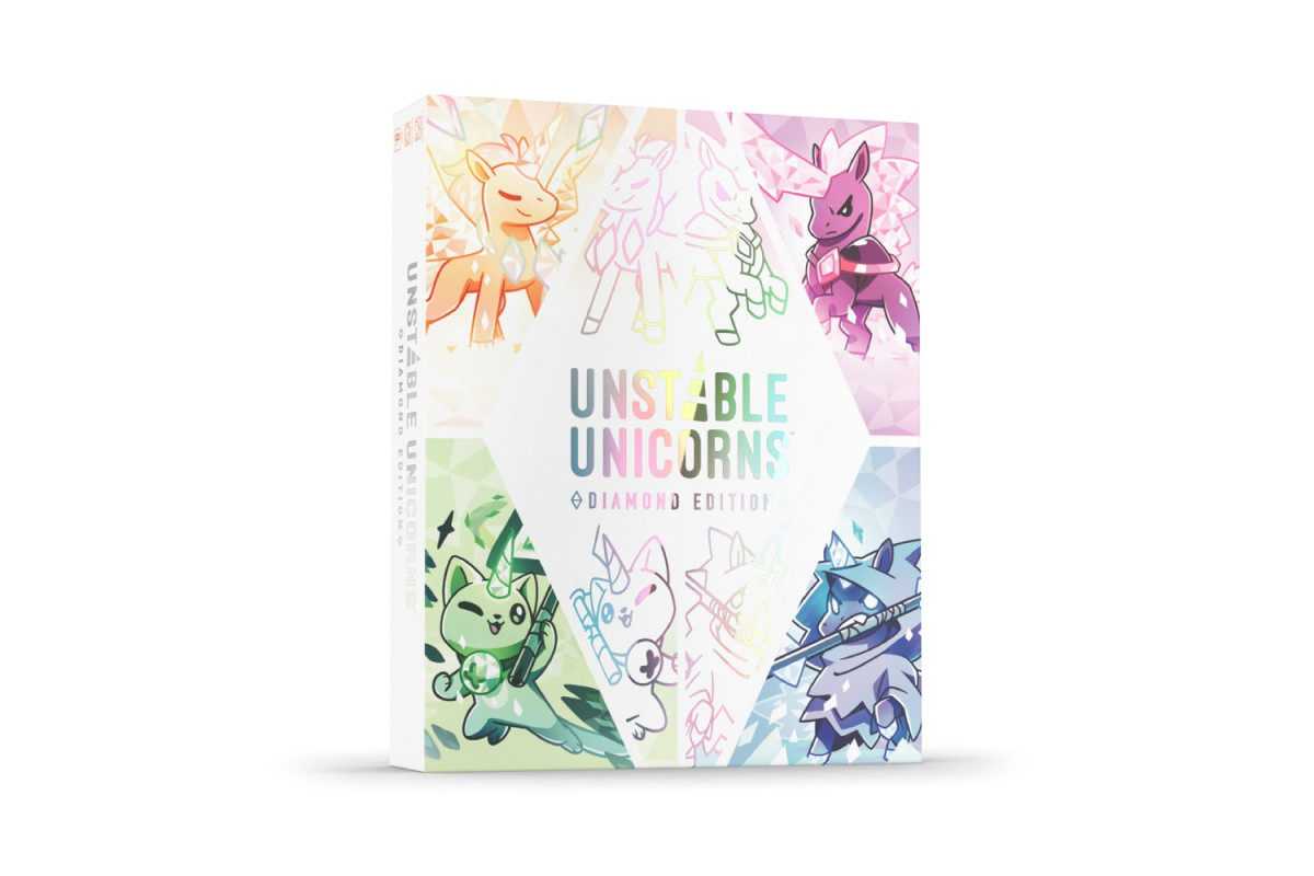 The Unstable Unicorns are back, and they're not horsing around. The Unstable Unicorns Diamond Edition introduces four Diamond Unicorns with powerful effects that level up the game. With all new foil-detailed box art, a sparkle core D4 die, and four holographic collector's cards, this deluxe version of Unstable Unicorns will have you building a Unicorn Army and betraying your friends like never before!