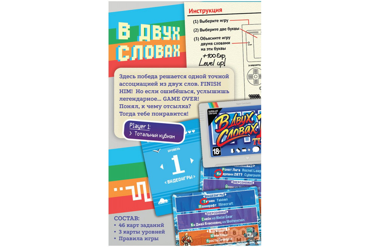 "В двух словах: Игры" – это увлекательная настольная игра, где вам предстоит объяснять названия и имена всего двумя словами, начинающимися на определённые буквы. В основе три уровня сложности, а каждый раунд – это новое испытание для вашей смекалки и эрудиции. Выбирайте карту, смотрите на цветные буквы невыбранных квестов и придумывайте ассоциации, которые приведут к победе. Уникальные правила запрещают однокоренные слова и жесты, делая игру ещё интереснее. А если хотите упростить задачу – воспользуйтесь "чит-кодом" из дополнительных правил!