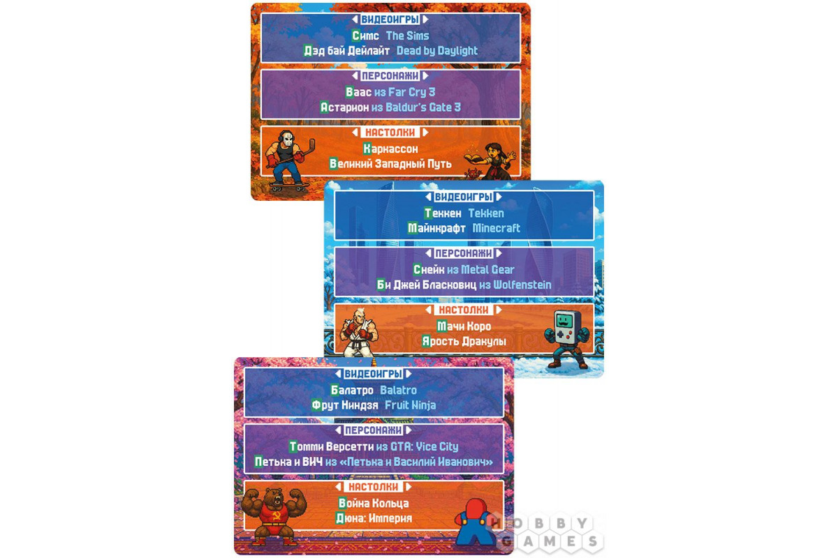Разложите три карты уровней по порядку и положите стопку на стол так, чтобы все видели номер очередности. На первом уровне вы будете отгадывать видеоигры, на втором – персонажей, в финальном – настолки. Затем каждый игрок получает по две карты – картриджа (всего четыре квеста, то есть наименования, на руках).