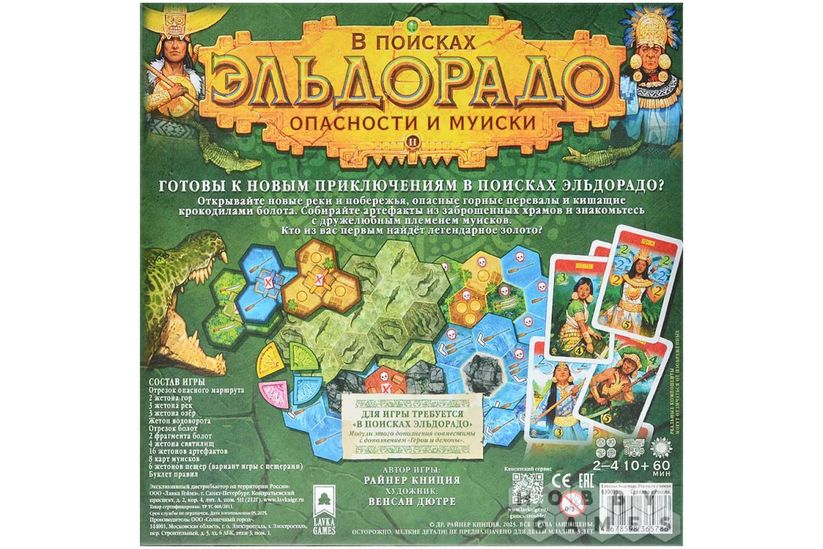 В составе дополнения представлены два отдельных модуля, которые легко комбинировать между собой. "Опасности" добавляют новые испытания и делают маршруты более сложными, а "Муиски" расширяют игру дополнительными картами и жетонами пещер, полезными во время экспедиции.