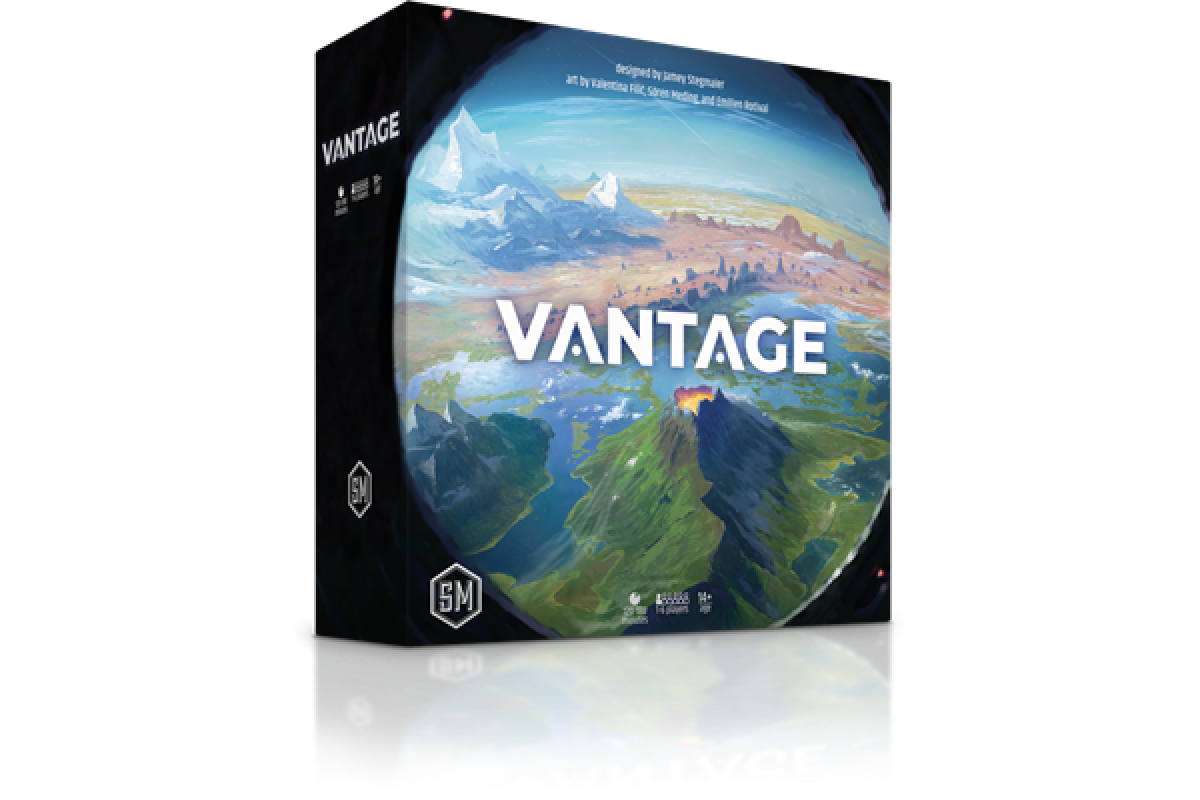 Vantage is an open-world, cooperative, roguelike adventure game for 1-6 players designed by Jamey Stegmaier. Vantage features an entire planet to explore, with players communicating while scattered across the world. With nearly 800 interconnected locations on cards and over 900 other discoverable cards, the world is your sandbox.