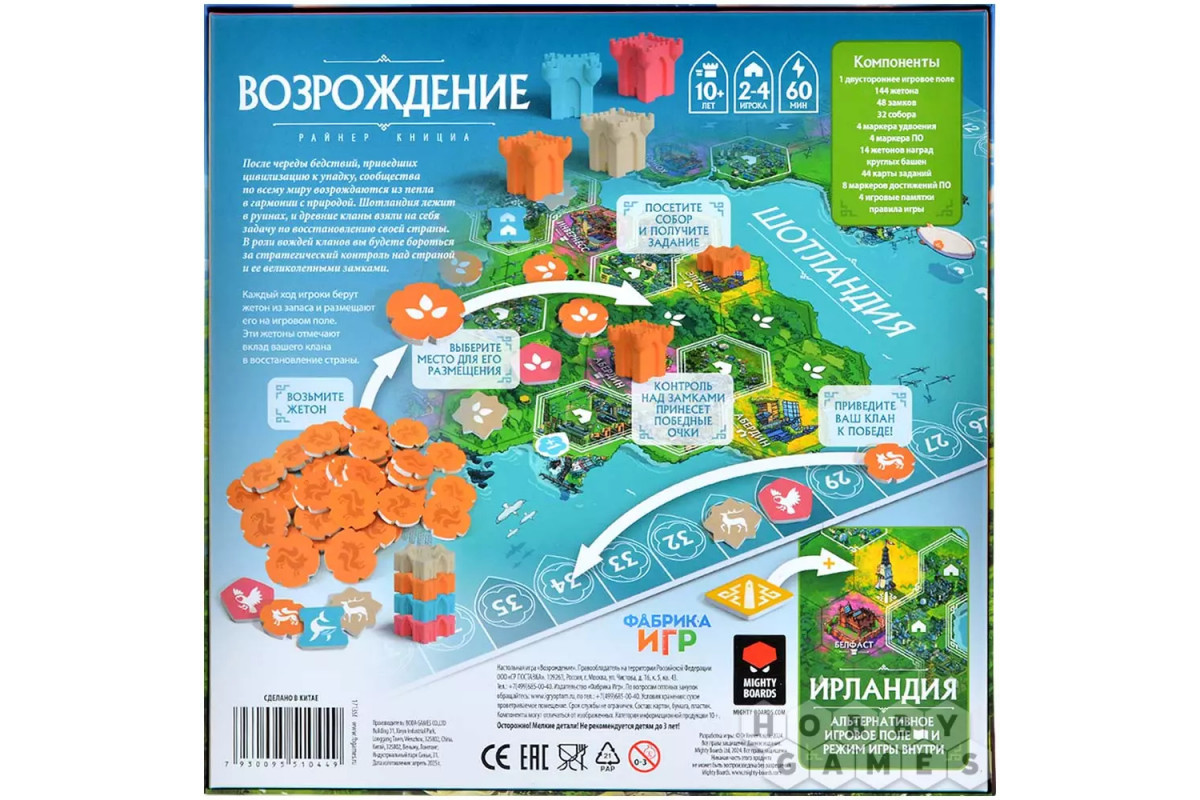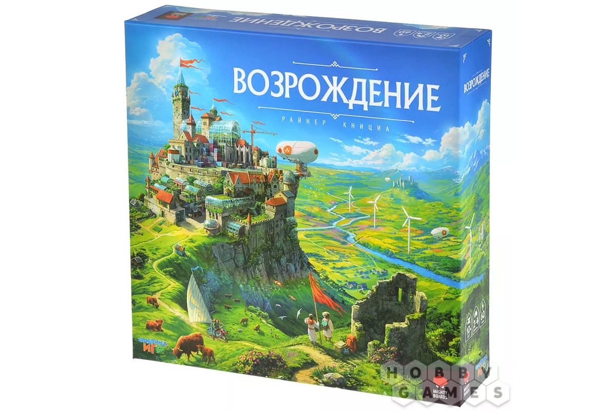 "Возрождение" – стратегическая евро-игра, которая сочетает простые правила с глубокими тактическими решениями. Игроки по очереди выставляют свои фишки на карту. Основная задача – создавать цепочки ферм для получения очков, основывать поселения разного размера для усиления контроля над регионами и окружать замки и соборы, чтобы получить за них дополнительные победные очки. Каждый ход – это тактический выбор: усилить свою сельскохозяйственную сеть, расширить поселение или перекрыть путь сопернику к ключевому объекту? Пространство ограничено, и к концу партии каждый ход становится решающим. Партия заканчивается, когда все игроки разместят свои жетоны. Подсчитываются очки за поселения, замки, задания и бонусные структуры. Победителем становится игрок, набравший наибольшее количество победных очков!