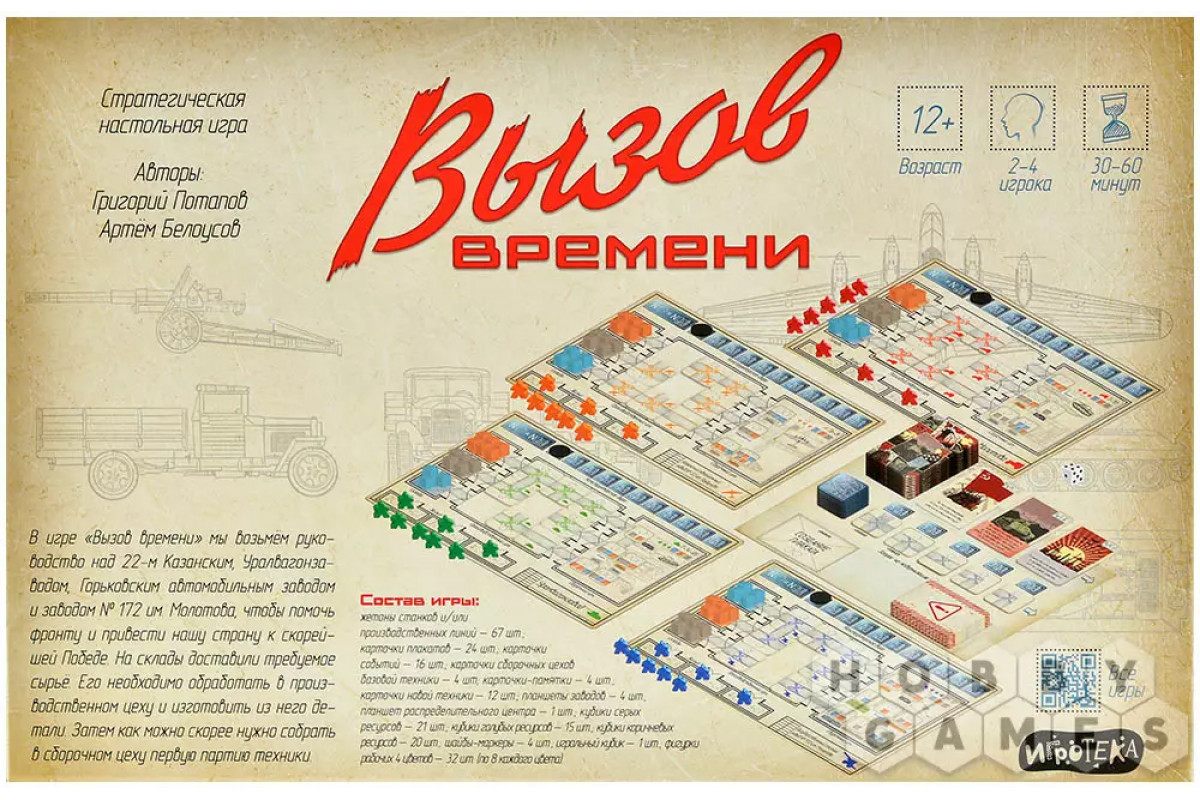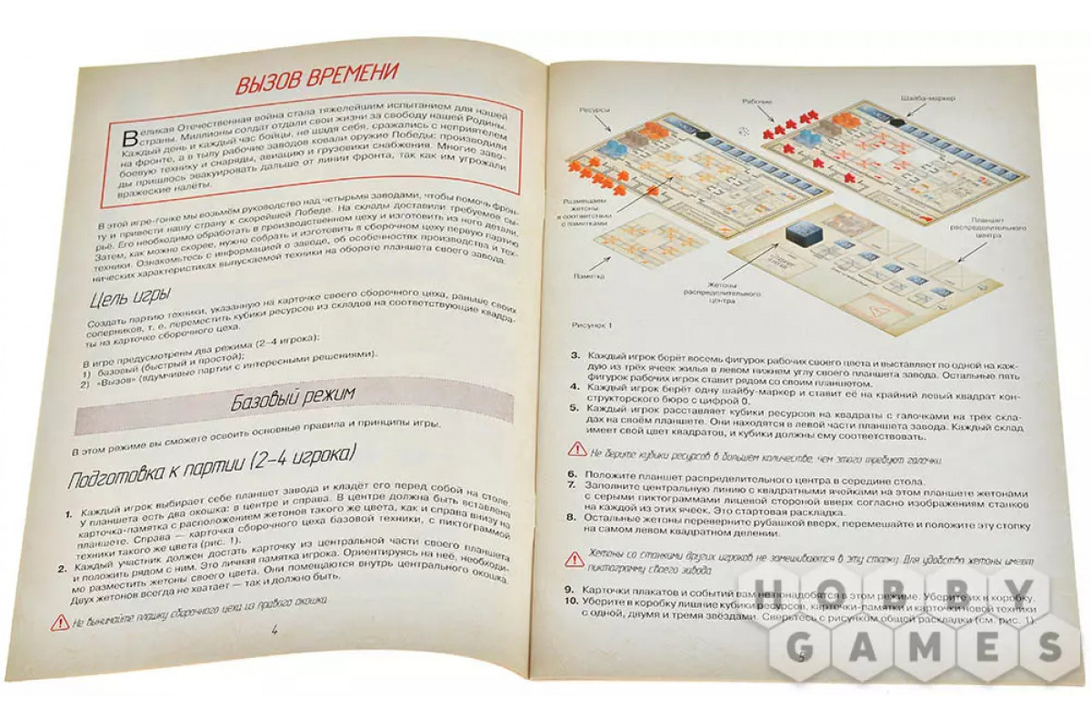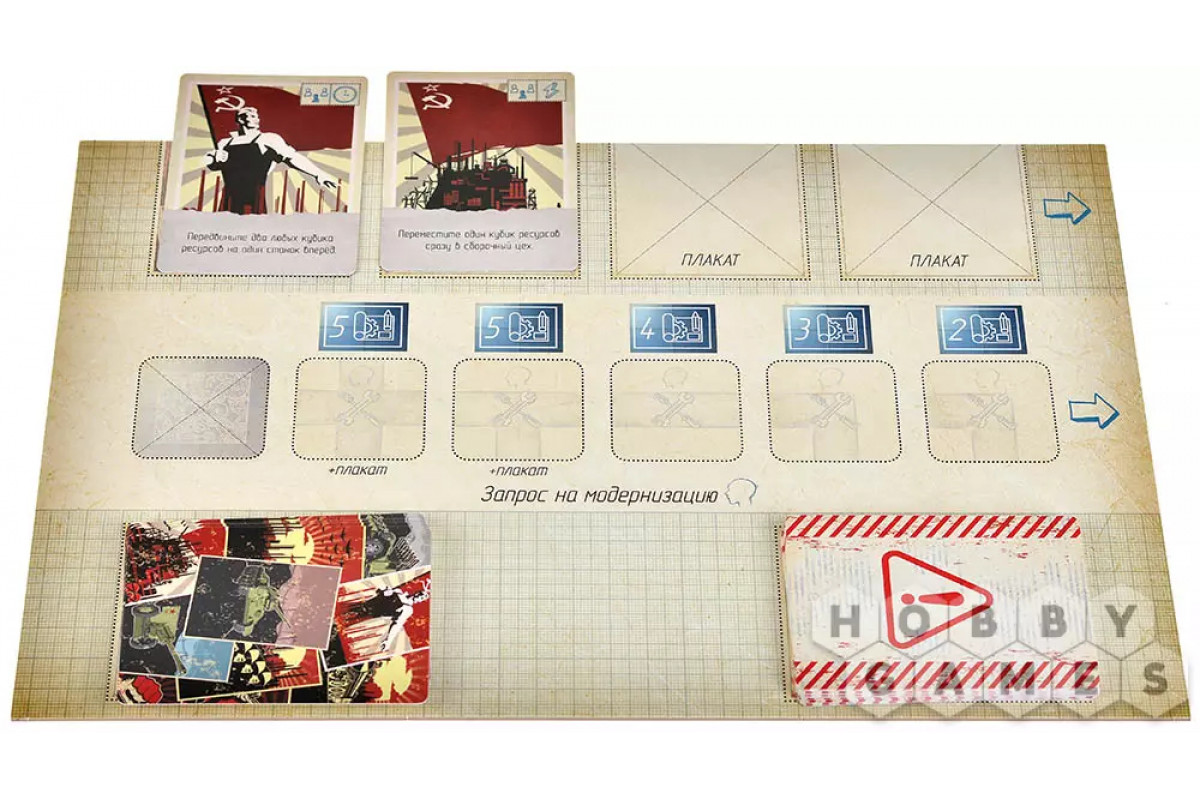 На обороте планшета каждого завода указаны особенности производства и характеристики выпускаемой техники. Цель игры – первым выполнить заказ: переместить кубики ресурсов со складов на карточку сборочного цеха согласно заданию. Кто быстрее соберёт свою партию – тот и победил!