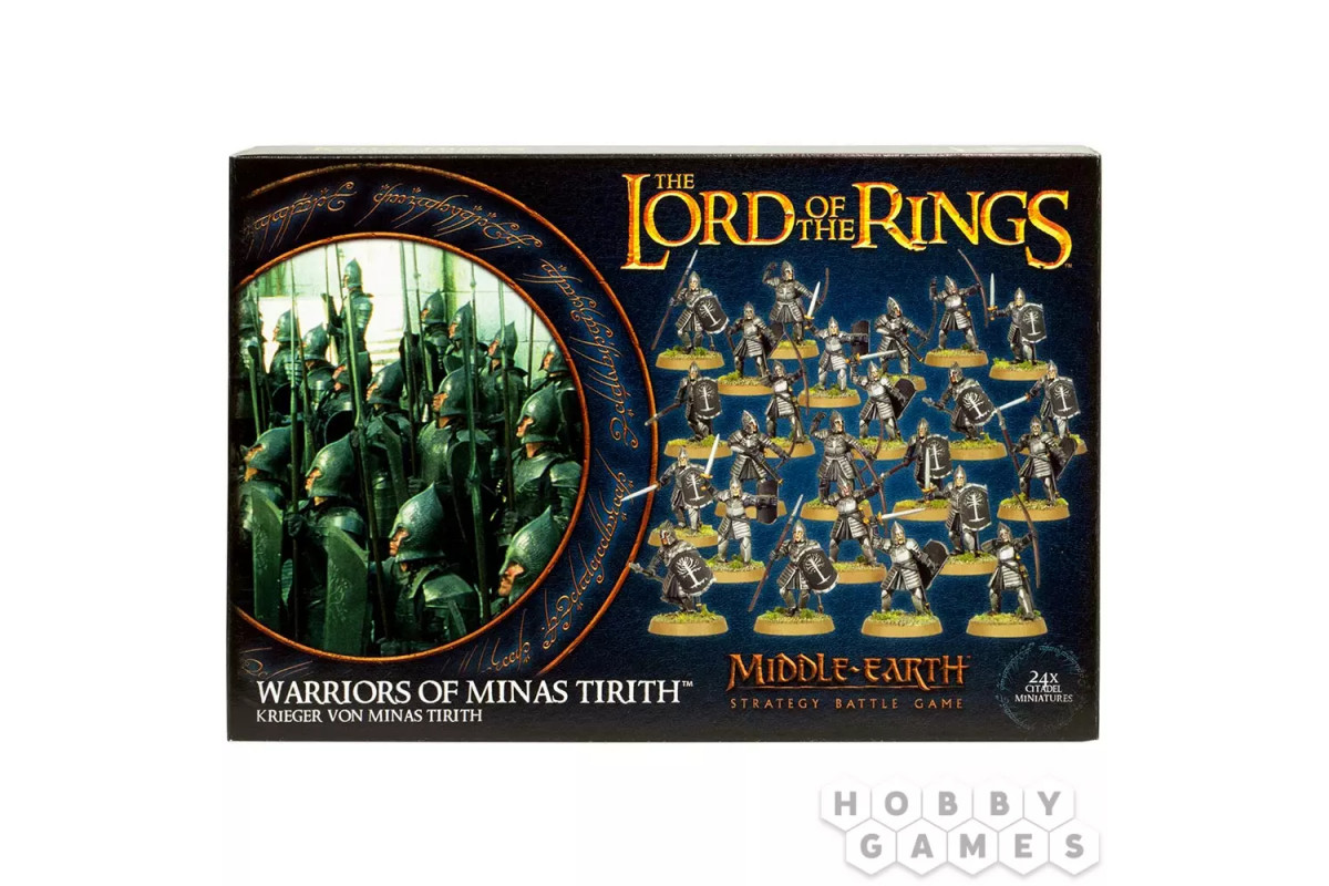 В данном наборе содержатся 32 компонента, необходимых для сборки 24 Воинов Минас Тирит (Warriors of Minas Tirith): 8 с луками, 8 с мечами и щитами и 8 с копьями и щитами. К каждой миниатюре прилагается круглая 25-миллиметровая подставка.