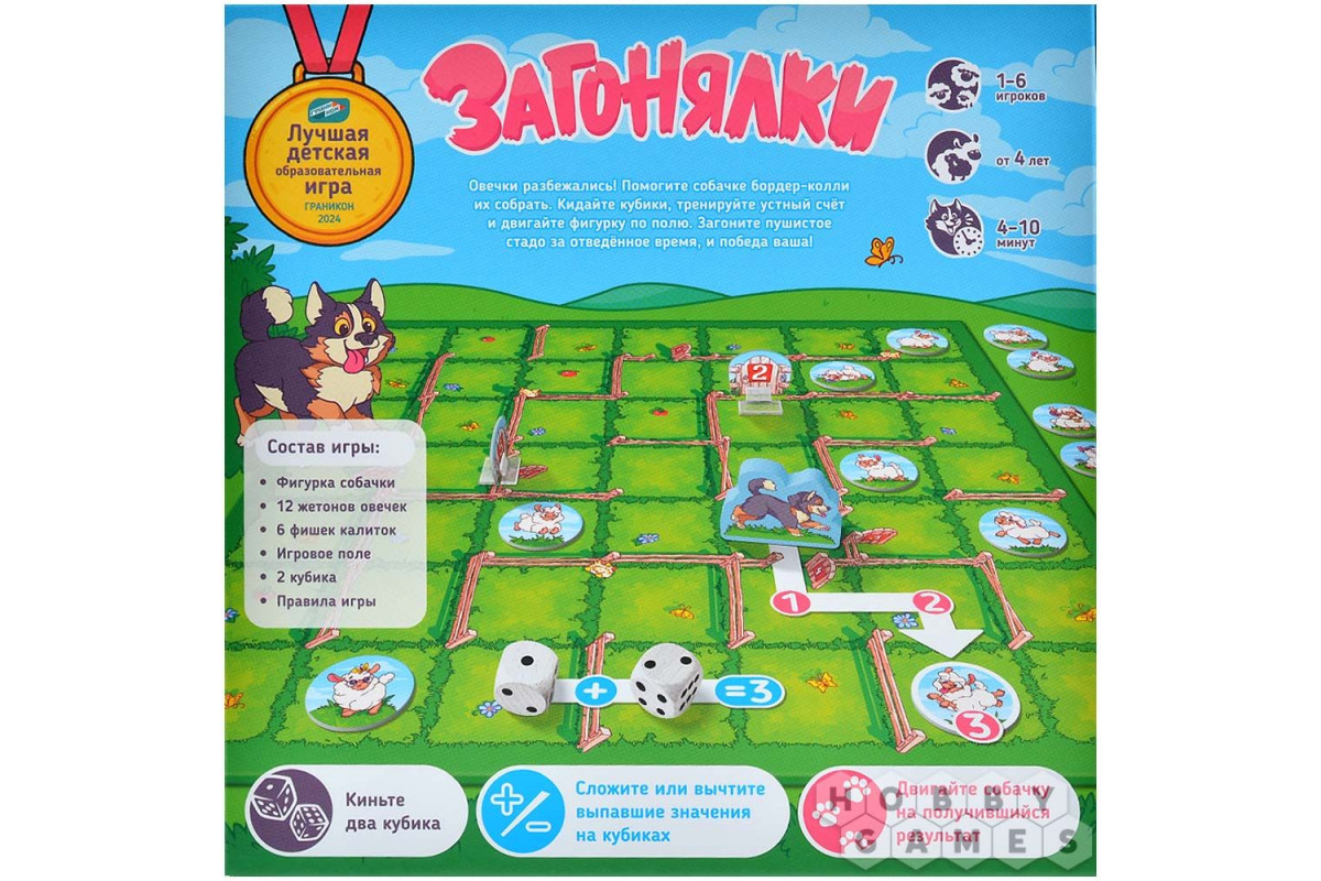 "Загонялки" – командная настольная игра для детей от 4 лет и их родителей, которая учит устному счёту, развитию внимания и логическому мышлению. Игроки бросают два кубика, складывают или вычитают их значения, и передвигают фигурку собачки по полю, собирая овечек с игрового поля и обходя закрывающиеся калитки. Благодаря простым правилам, разным вариантам сложности и весёлому игровому процессу "Загонялки" получили награду "Лучшая детская образовательная игра" на Граниконе 2024 – а это лишь подтверждает высокий уровень этой настолки! Ведь она не только развлекает, но и помогает ребёнку учиться в игре, развивая ключевые навыки!