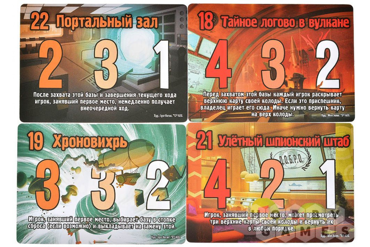 Когда суммарная мощь ваших приспешников преодолевает защитный рубеж базы, наступает кульминационный момент – начало захвата! В этот решающий момент участники сравнивают боевой потенциал своих группировок: доминирующая получает очки за первое место, а следующие претенденты – за второе и третье. При равных показателях соперники оказываются на высшей позиции (два равных по силе игрока делят первенство, оставляя третью позицию следующему участнику). После успешного захвата поле боя очищается – все карты отправляются в сброс, а на арену выходят новые приспешники, готовые к новым свершениям. Завершая свой ход, вы пополняете арсенал двумя новыми картами, однако если ваша рука переполнена (более 10 единиц), необходимо расстаться с лишними.