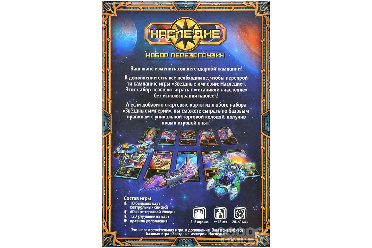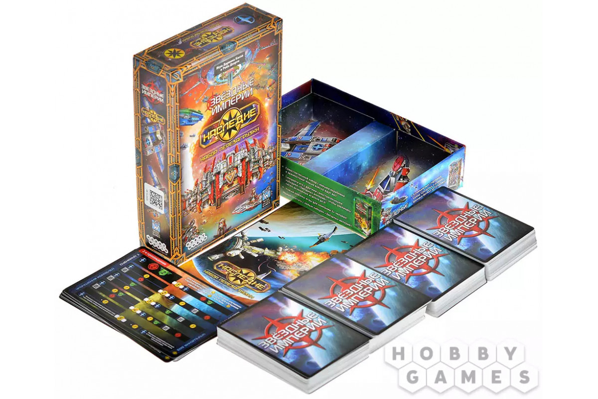 "Звёздные империи: Наследие" – это колодостроительная космическая стратегия с полноценной сюжетной кампанией, где каждый сценарий открывает новые карты, фракции и правила. Игра создана на основе серии "Звёздные империи", поэтому поклонники быстрее вольются в процесс, а новички смогут легко освоиться. По мере прохождения вы будете улучшать корабли и базы, влиять на торговую колоду, получать новые сценарные цели и усиливать влияние своей стороны. После завершения кампании набор превратится в полноценную игру для 2-6 человек, а ещё его можно будет сочетать с другими коробками серии!