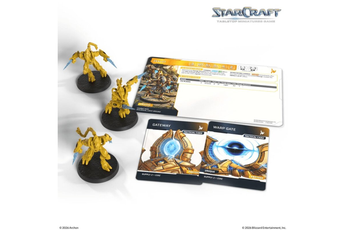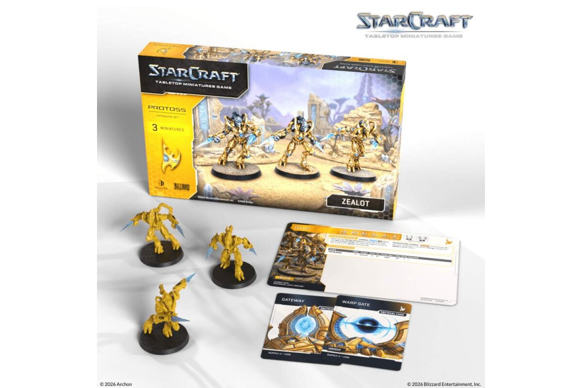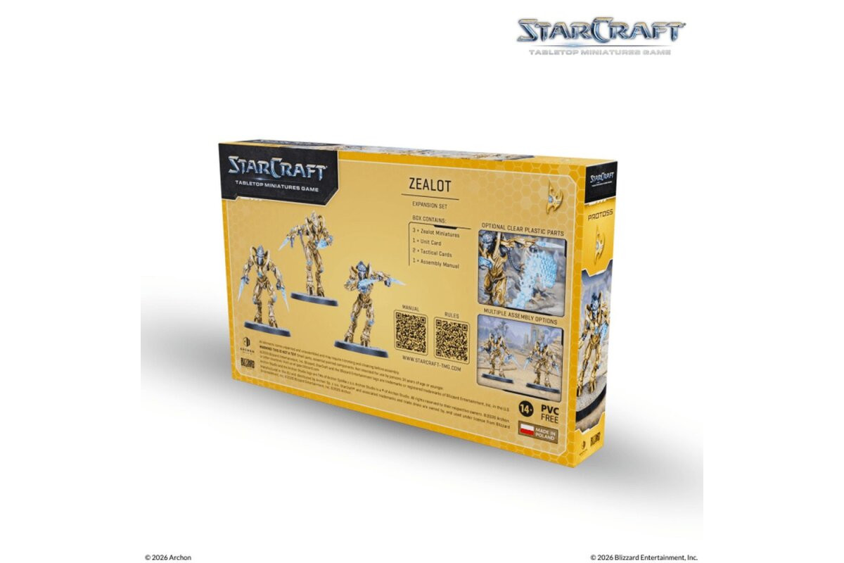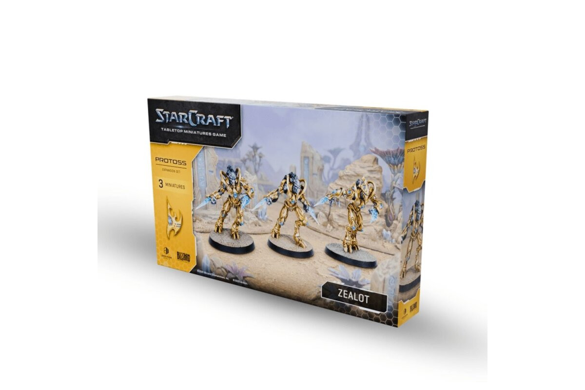 The StarCraft® Zealot brings the relentless Protoss frontline to the tabletop. As lower-ranked Templar, Zealots operate in platoons and legions and form the backbone of the Protoss military.Each Zealot has decades of hand-to-hand combat training and hunts enemies without mercy once a target is in reach. This set makes a striking addition to your StarCraft Tabletop Miniatures Game battles.Contents: 3x Zealot (miniatures) 3x Bases (40mm) 3x Cards (cards) 1x Assembly Manual (manual)Note: These miniatures are unpainted and require assembly. Caution! Contains small parts, not suitable for children under 36 months of age.