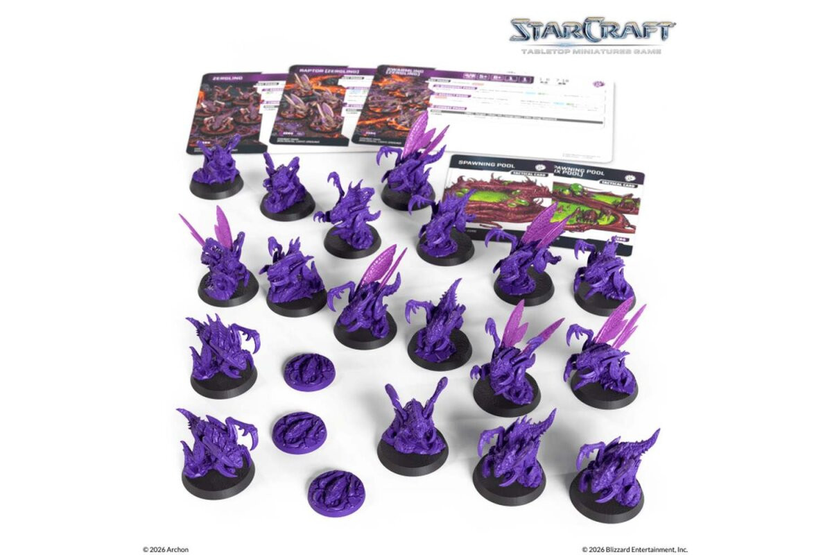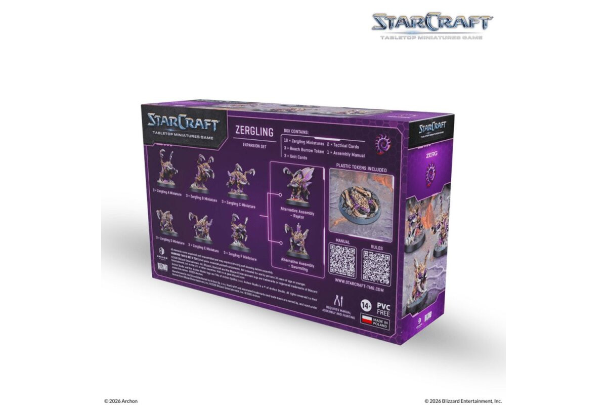 The StarCraft® Zergling is the backbone of any Zerg army, delivering a fast and especially deadly response to threats against the Hive. On the tabletop, this unit adds aggressive pressure and high mobility to your battles.The set broadens your tactical options with evolution variants such as the Raptor and the Swarmling. This lets you tailor your force to different opponents and strategies by fielding different profiles for new in-game choices.Contents: 18x Zergling (miniature) 18x Bases (32mm) 1x Unit Card Zergling (card) 1x Unit Card Raptor (Zergling) (card) 1x Unit Card Swarmling (Zergling) (card) 2x Tactical Card (card) 1x Assembly Manual (manual)Note: These miniatures are unpainted and require assembly. Caution! Contains small parts, not suitable for children under 36 months of age.