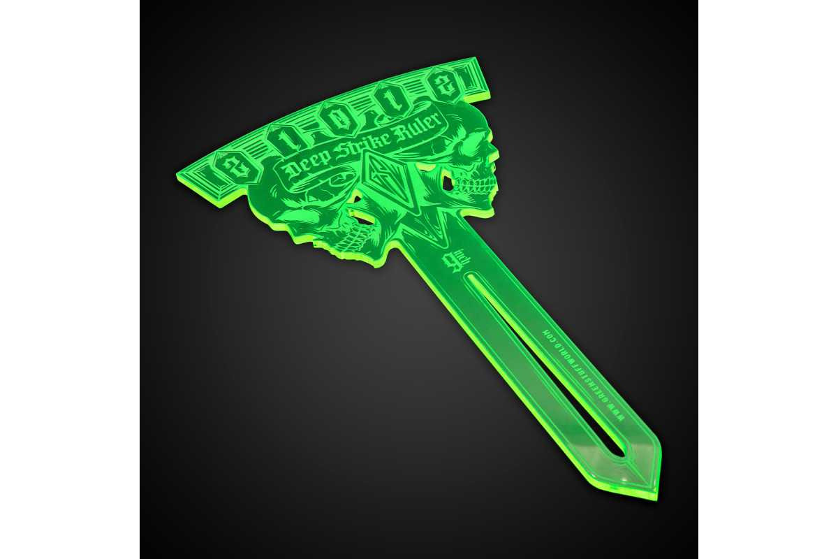Этот полностью совместимый инструмент вырезан лазером из 3-мм флуоресцентного акрила толщиной 3 мм, что позволяет легко просунуть его между плотно стоящими элементами террейна, не смещая и не задевая их. В отличие от рулетки, это один жёсткий цельный шаблон — его можно приложить вплотную к подставке модели и поворачивать, формируя идеальную 9-дюймовую зону запрета в любом направлении.