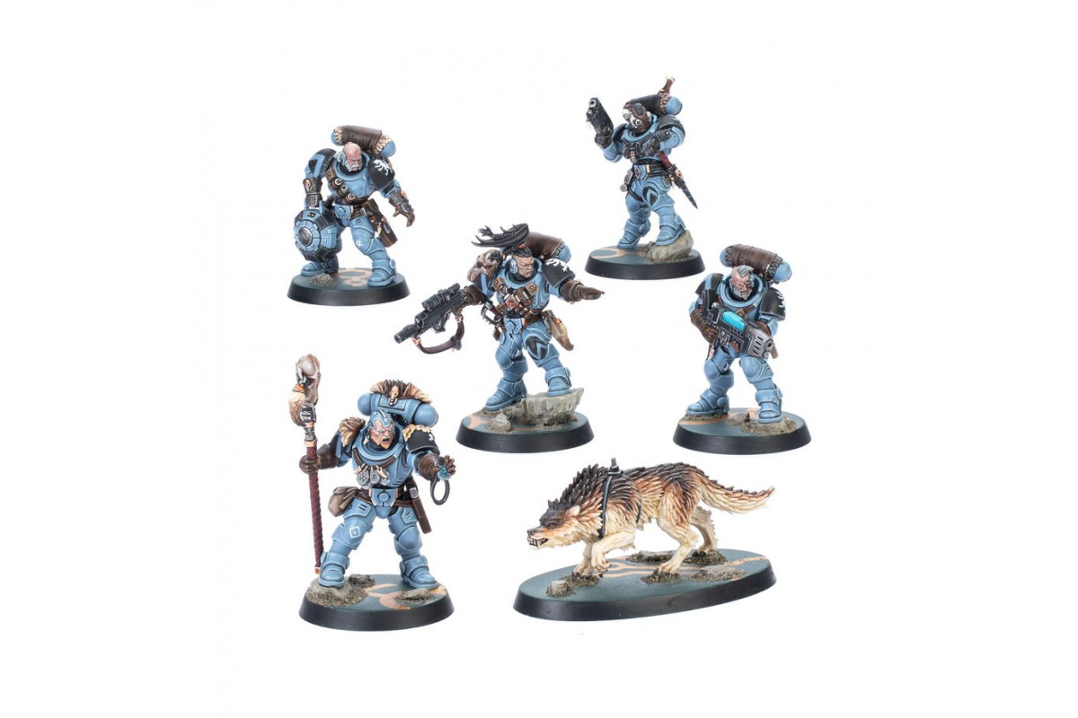 This kill team relies on experience, cunning, and the primal ferocity of Fenris. The Wolf Scouts strike from ambush, exploit terrain and surprise, and withdraw before the enemy can react. Fighting at their side is a loyal and ferocious Fenrisian Wolf, whose keen senses and brutal strength make it a fearsome companion on the hunt.