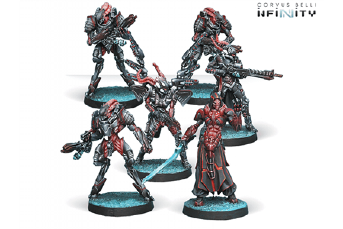 In this box you will find: 3 Unidron Batdroids with Plasma Carbines, loyal and trustable REM troops; 1 Maakrep Sniper, a hunter-killer from the Sygmaa, the Tohaa aliens who fights for the EI; 1 Fraacta jump trooper, a Sygmaa parachutist with a symbiont gear which provides her the Transmutation Special Skill; and an Umbra Legate, as lethal as mysterious martial artists who are the second in command of the Evolved Intelligence. Get ready for the arrival of the reinforcements for the Combined Army, we are sure the Human Sphere is not!