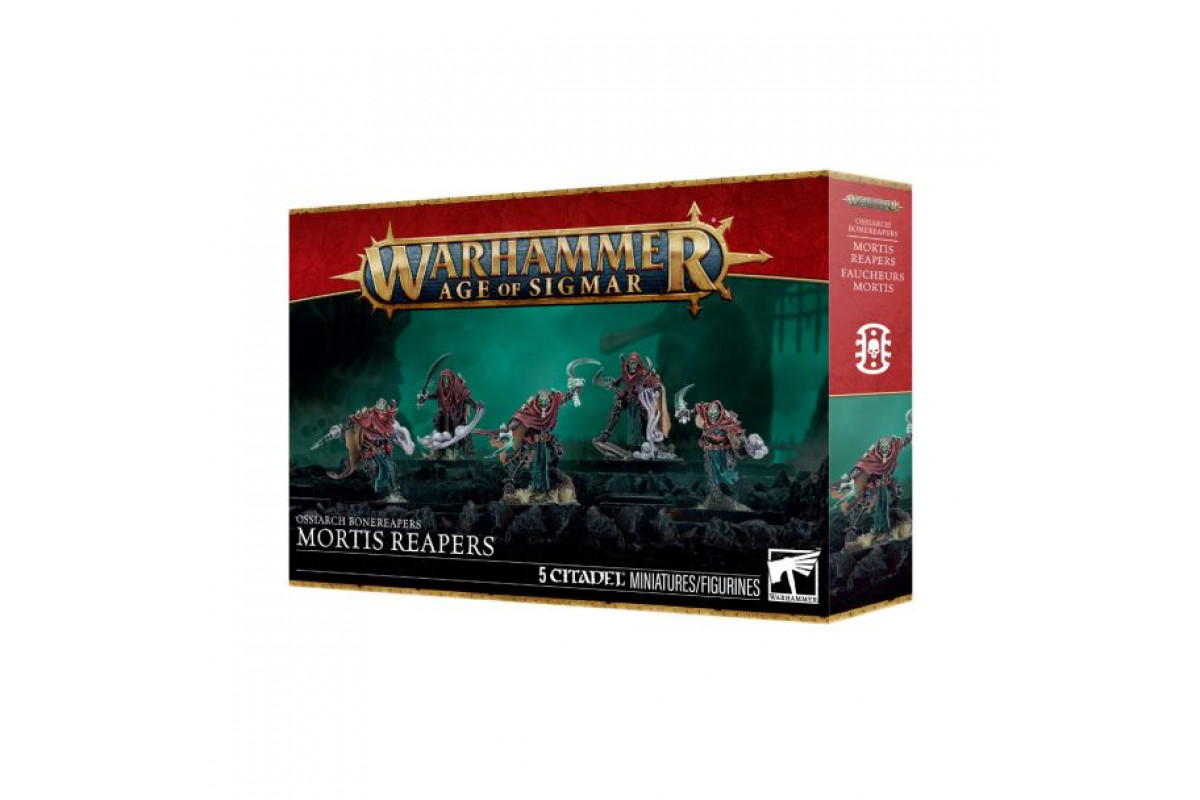 This multipart plastic kit builds five Mortis Reapers, deadly assassins for your Ossiarch Bonereapers armies in games of Warhammer Age of Sigmar. Clad in ragged robes, they rush into combat with enemy leaders and cut them down with lethal reaper's blades, before tossing down necrocaches – flesh-melting grave sand bombs – and leaping away. There are parts to build an optional champion, and each other Reaper can be assembled with a second blade or a necrocache billowing smoke. The kit also comes with 16 interchangeable necrocaches that can be added to the belts of your assassins.